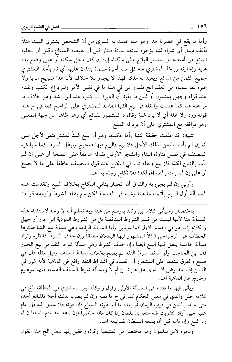 باختصار وسيأتي كلام ابن رشد بأوسع من هذا وبه تعلم أنه لا وجه لاستثناء هذه المسألة هنا لأنها ليست من قسم الشروط المناقضة بل من الشروط المؤدية إلى غرر أو جهل والكلام إنما هو في القسم الأول كما سيتبين وأما المسألة الرابعة وهي مسألة بيع الثنيا فذكرها الحطاب عن الرجراجي قائلًا المشهور فيها البطلان مطلقًا وإن حذف الشرط فانظره وتزاد مسألة خامسة يبطل فيها البيع أيضًا وإن حذف الشرط وهي مسألة شرط النقد في بيع الخيار قال ابن الحاجب ولو أسقط شرط النقد لم يصح بخلاف مسقط السلف وقيل مثله قال في ضيح والفرق بينهما على المشهور أن الفساد في اشتراط النقد واقع في الماهية لأنه غرر في الثمن إذ المقبوض لا يدري هل هو ثمن أم لا ومسألة شرط السلف الفساد فيها موهوم وخارج عن الماهية اهـ.