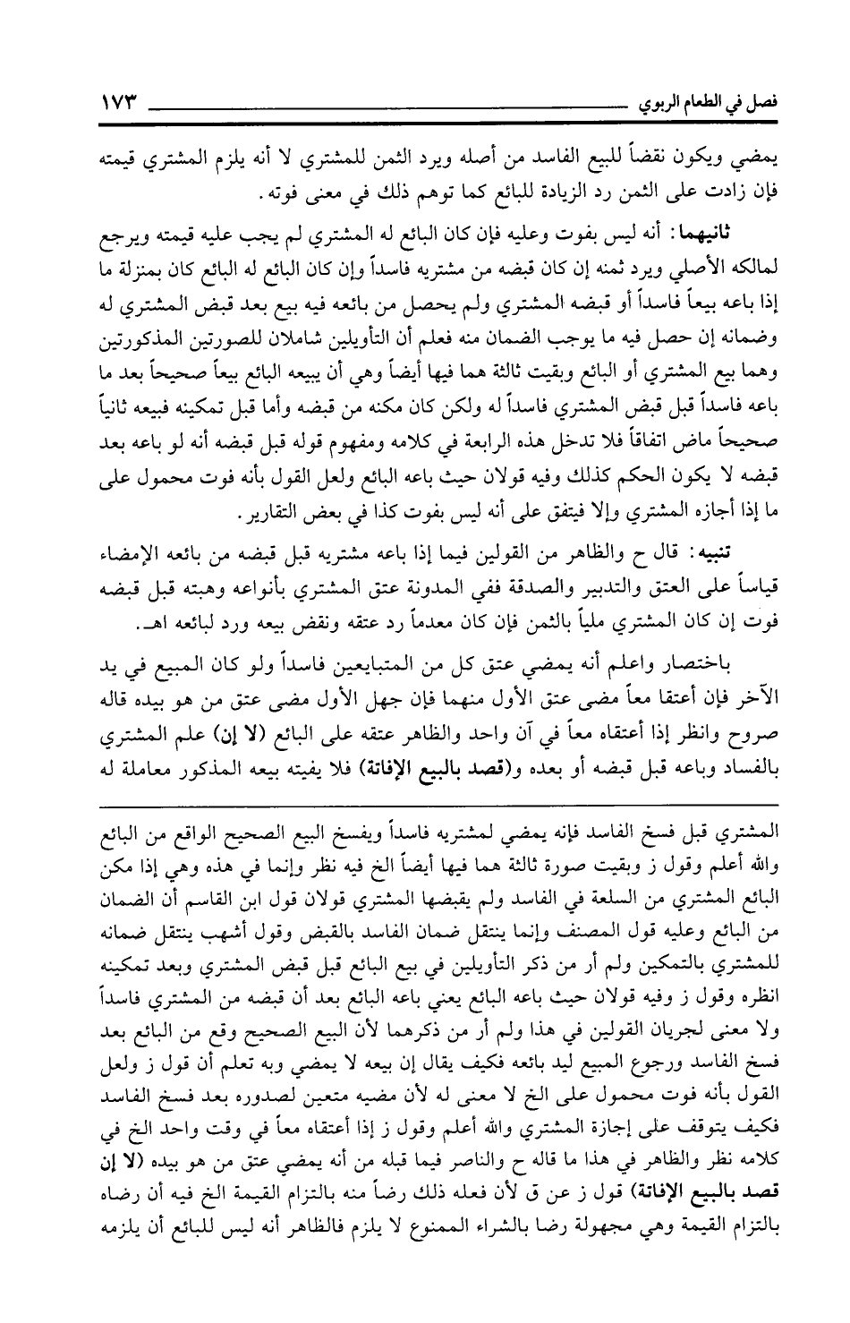 المشتري قبل فسخ الفاسد فإنه يمضي لمشتريه فاسدًا ويفسخ البيع الصحيح الواقع من البائع والله أعلم وقول ز وبقيت صورة ثالثة هما فيها أيضًا الخ فيه نظر وإنما في هذه وهي إذا مكن البائع المشتري من السلعة في الفاسد ولم يقبضها المشتري قولان قول ابن القاسم أن الضمان من البائع وعليه قول المصنف وإنما ينتقل ضمان الفاسد بالقبض وقول أشهب ينتقل ضمانه للمشتري بالتمكين ولم أر من ذكر التأويلين في بيع البائع قبل قبض المشتري وبعد تمكينه انظره وقول ز وفيه قولان حيث باعه البائع يعني باعه البائع بعد أن قبضه من المشتري فاسدًا ولا معنى لجريان القولين في هذا ولم أر من ذكرهما لأن البيع الصحيح وقع من البائع بعد فسخ الفاسد ورجوع المبيع ليد بائعه فكيف يقال إن بيعه لا يمضي وبه تعلم أن قول ز ولعل القول بأنه فوت محمول على الخ لا معنى له لأن مضيه متعين لصدوره بعد فسخ الفاسد فكيف يتوقف على إجازة المشتري والله أعلم وقول ز إذا أعتقاه معًا في وقت واحد الخ في كلامه نظر والظاهر في هذا ما قاله ح والناصر فيما قبله من أنه يمضي عتق من هو بيده (لا إن قصد بالبيع الإفاتة) قول ز عن ق لأن فعله ذلك رضًا منه بالتزام القيمة الخ فيه أن رضاه بالتزام القيمة وهي مجهولة رضا بالشراء الممنوع لا يلزم فالظاهر أنه ليس للبائع أن يلزمه