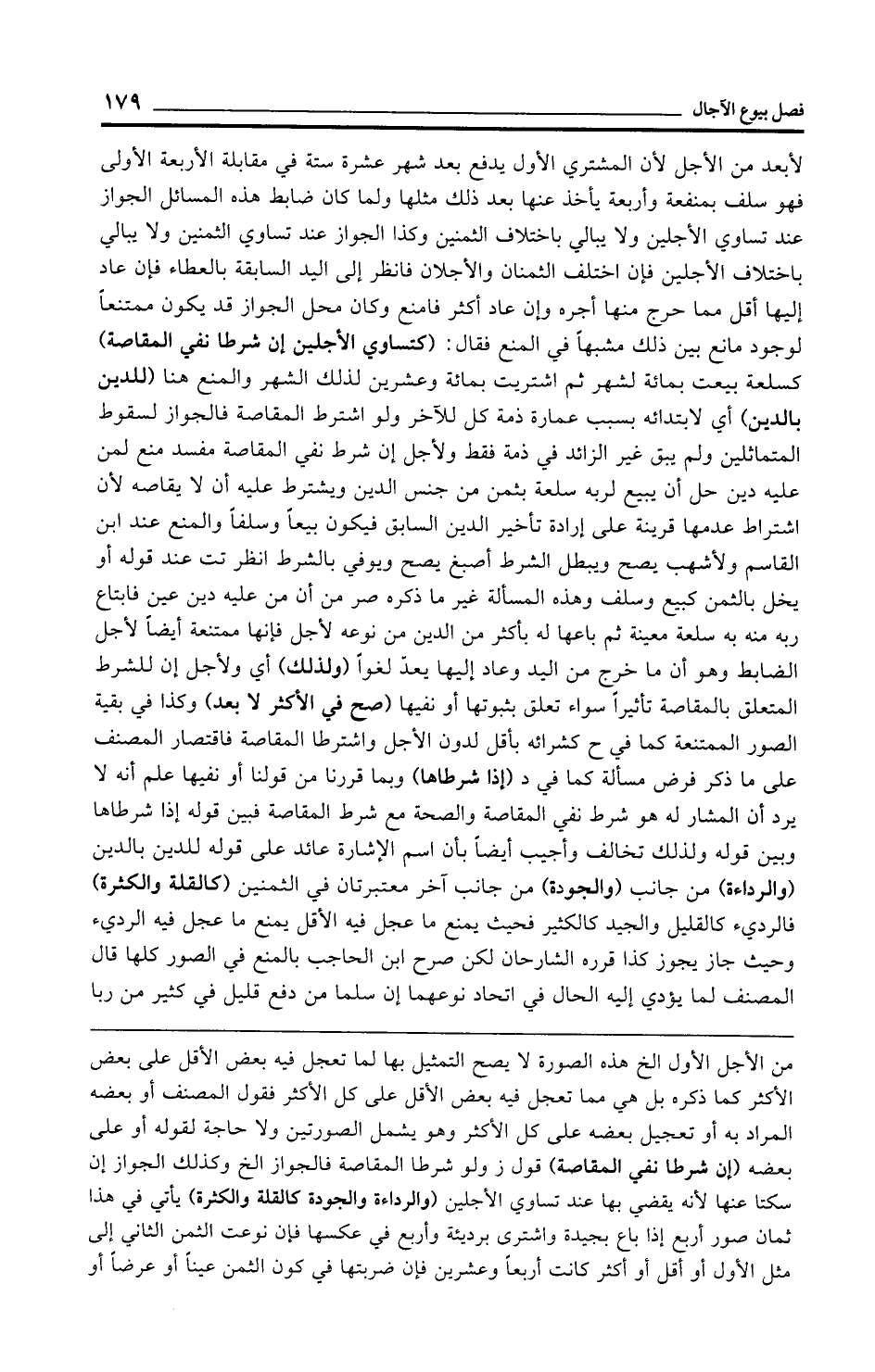 من الأجل الأول الخ هذه الصورة لا يصح التمثيل بها لما تعجل فيه بعض الأقل على بعض الأكثر كما ذكره بل هي مما تعجل فيه بعض الأقل على كل الأكثر فقول المصنف أو بعضه المراد به أو تعجيل بعضه على كل الأكثر وهو يشمل الصورتين ولا حاجة لقوله أو على بعضه (إن شرطا نفي المقاصة) قول ز ولو شرطا المقاصة فالجواز الخ وكذلك الجواز إن سكتا عنها لأنه يقضي بها عند تساوي الأجلين (والرداءة والجودة كالقلة والكثرة) يأتي في هذا ثمان صور أربع إذا باع بجيدة واشترى برديئة وأربع في عكسها فإن نوعت الثمن الثاني إلى مثل الأول أو أقل أو أكثر كانت أربعًا وعشرين فإن ضربتها في كون الثمن عينًا أو عرضًا أو