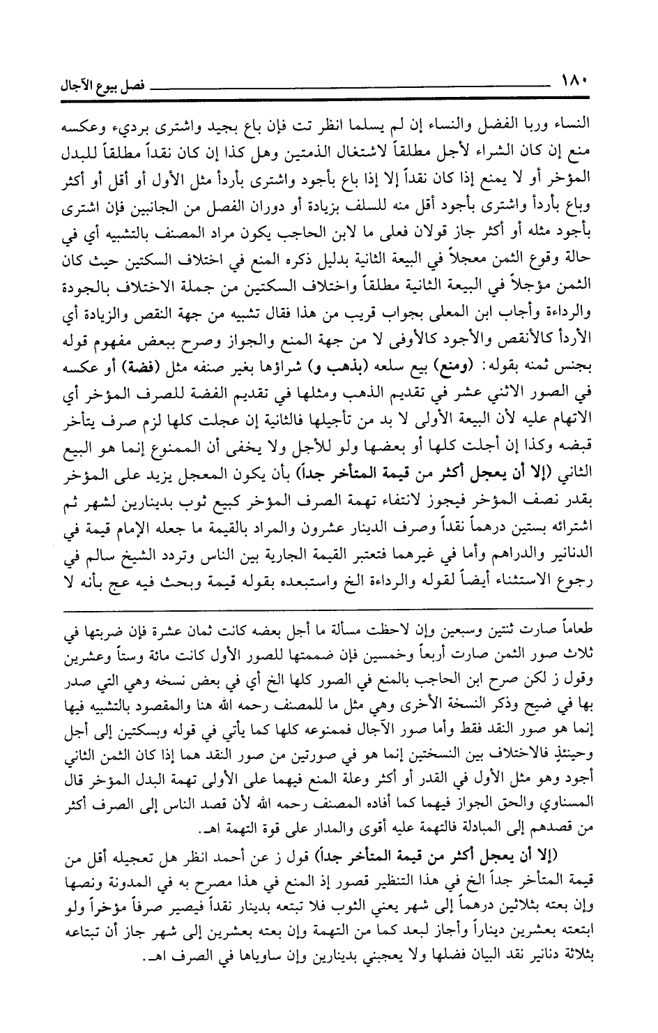 النساء وربا الفضل والنساء إن لم يسلما انظر تت فإن باع بجيد واشترى برديء وعكسه منع إن كان الشراء لأجل مطلقًا لاشتغال الذمتين وهل كذا إن كان نقدًا مطلقًا للبدل المؤخر أو لا يمنع إذا كان نقدًا إلا إذا باع بأجود واشترى بأردأ مثل الأول أو أقل أو أكثر وباع بأردأ واشترى بأجود أقل منه للسلف بزيادة أو دوران الفصل من الجانبين فإن اشترى بأجود مثله أو أكثر جاز قولان فعلى ما لابن الحاجب يكون مراد المصنف بالتشبيه أي في حالة وقوع الثمن معجلًا في البيعة الثانية بدليل ذكره المنع في اختلاف السكتين حيث كان الثمن مؤجلًا في البيعة الثانية مطلقًا واختلاف السكتين من جملة الاختلاف بالجودة والرداءة وأجاب ابن المعلى بجواب قريب من هذا فقال تشبيه من جهة النقص والزيادة أي الأردأ كالأنقص والأجود كالأوفى لا من جهة المنع والجواز وصرح ببعض مفهوم قوله بجنس ثمنه بقوله: (ومنع) بيع سلعه (بذهب و) شراؤها بغير صنفه مثل (فضة) أو عكسه في الصور الاثني عشر في تقديم الذهب ومثلها في تقديم الفضة للصرف المؤخر أي الاتهام عليه لأن البيعة الأولى لا بد من تأجيلها فالثانية إن عجلت كلها لزم صرف يتأخر قبضه وكذا إن أجلت كلها أو بعضها ولو للأجل ولا يخفى أن الممنوع إنما هو البيع الثاني (إلا أن يعجل أكثر من قيمة المتأخر جدًّا) بأن يكون المعجل يزيد على المؤخر بقدر نصف المؤخر فيجوز لانتفاء تهمة الصرف المؤخر كبيع ثوب بدينارين لشهر ثم اشترائه بستين درهمًا نقدًا وصرف الدينار عشرون والمراد بالقيمة ما جعله الإمام قيمة في الدنانير والدراهم وأما في غيرهما فتعتبر القيمة الجارية بين الناس وتردد الشيخ سالم في رجوع الاستثناء أيضًا لقوله والرداءة الخ واستبعده بقوله قيمة وبحث فيه عج بأنه لا