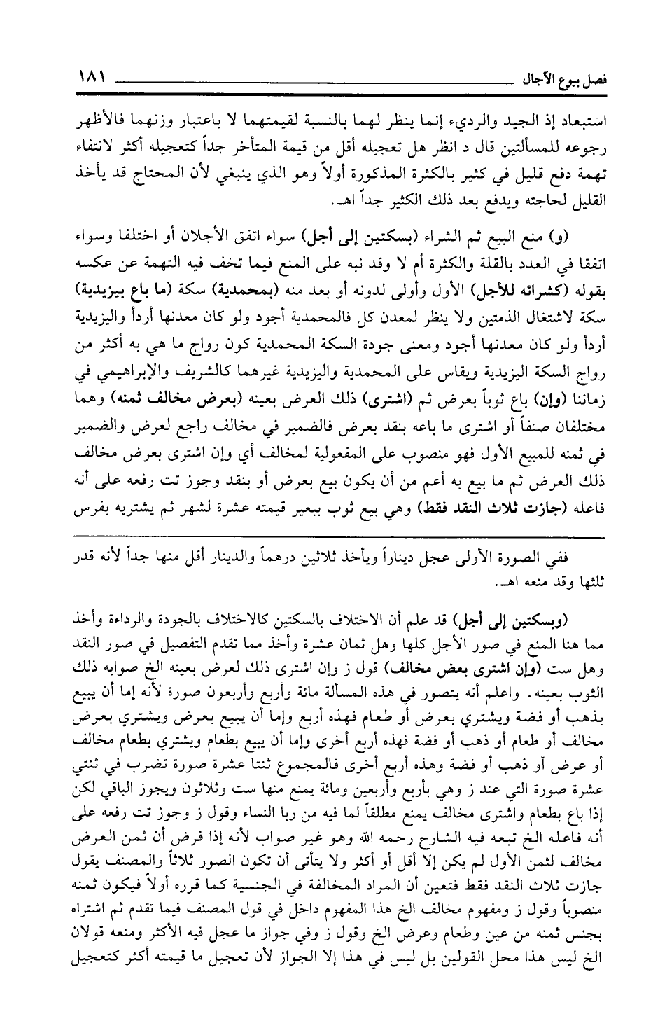 (و) منع البيع ثم الشراء (بسكتين إلى أجل) سواء اتفق الأجلان أو اختلفا وسواء اتفقا في العدد بالقلة والكثرة أم لا وقد نبه على المنع فيما تخف فيه التهمة عن عكسه بقوله (كشرائه للأجل) الأول وأولى لدونه أو بعد منه (بمحمدية) سكة (ما باع بيزيدية) سكة لاشتغال الذمتين ولا ينظر لمعدن كل فالمحمدية أجود ولو كان معدنها أردأ واليزيدية أردأ ولو كان معدنها أجود ومعنى جودة السكة المحمدية كون رواج ما هي به أكثر من رواج السكة اليزيدية ويقاس على المحمدية واليزيدية غيرهما كالشريف والإبراهيمي في زماننا (وإن) باع ثوبًا بعرض ثم (اشترى) ذلك العرض بعينه (بعرض مخالف ثمنه) وهما مختلفان صنفًا أو اشترى ما باعه بنقد بعرض فالضمير في مخالف راجع لعرض والضمير في ثمنه للمبيع الأول فهو منصوب على المفعولية لمخالف أي وإن اشترى بعرض مخالف ذلك العرض ثم ما بيع به أعم من أن يكون بيع بعرض أو بنقد وجوز تت رفعه على أنه فاعله (جازت ثلاث النقد فقط) وهي بيع ثوب ببعير قيمته عشرة لشهر ثم يشتريه بفرس