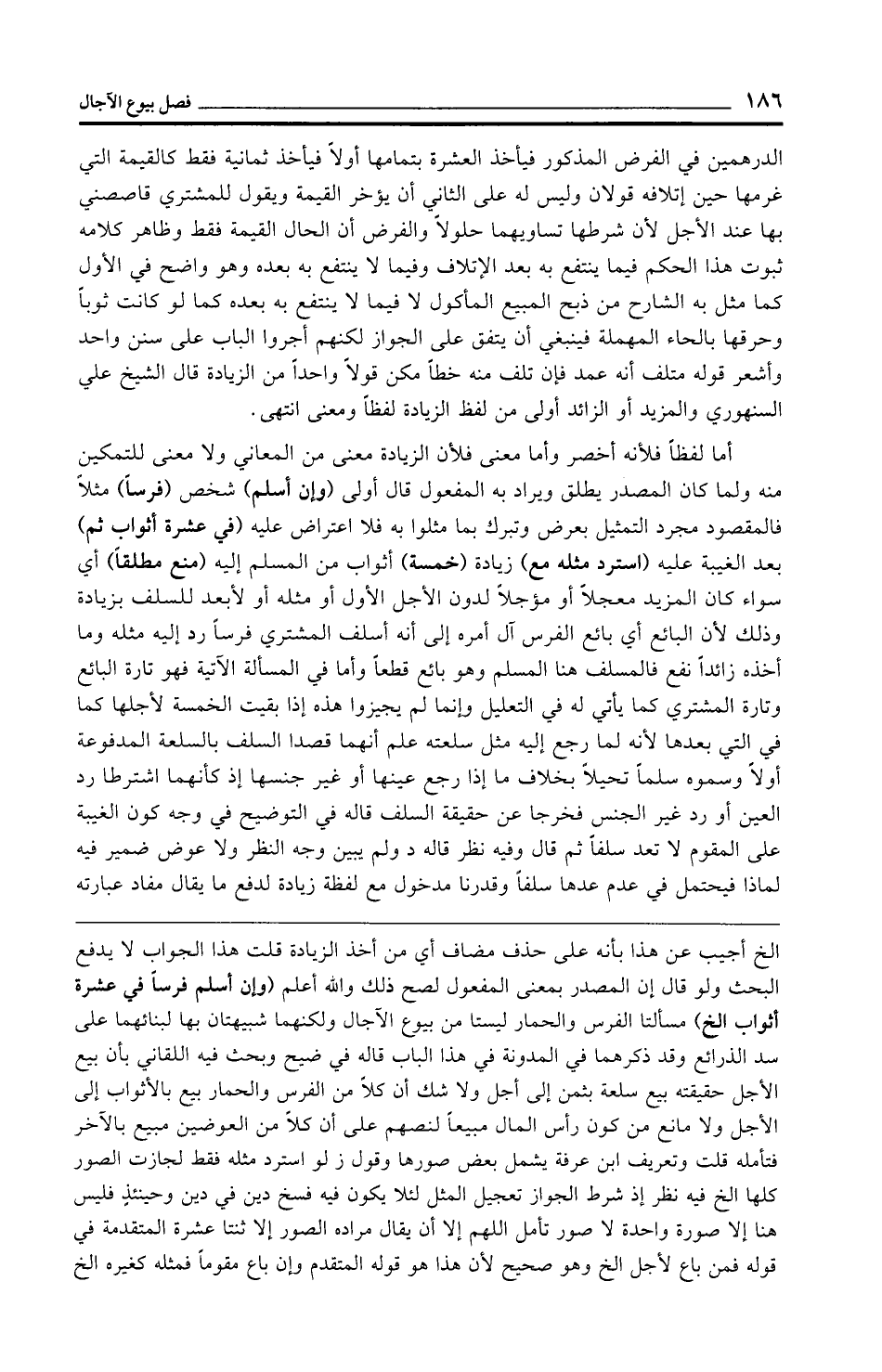 الخ أجيب عن هذا بأنه على حذف مضاف أي من أخذ الزيادة قلت هذا الجواب لا يدفع البحث ولو قال إن المصدر بمعنى المفعول لصح ذلك والله أعلم (وإن أسلم فرسًا في عشرة أثواب الخ) مسألتا الفرس والحمار ليستا من بيوع الآجال ولكنهما شبيهتان بها لبنائهما على سد الذرائع وقد ذكرهما في المدونة في هذا الباب قاله في ضيح وبحث فيه اللقاني بأن بيع الأجل حقيقته بيع سلعة بثمن إلى أجل ولا شك أن كلًّا من الفرس والحمار بيع بالأثواب إلى الأجل ولا مانع من كون رأس المال مبيعًا لنصهم على أن كلا من العوضين مبيع بالآخر فتأمله قلت وتعريف ابن عرفة يشمل بعض صورها وقول ز لو استرد مثله فقط لجازت الصور كلها الخ فيه نظر إذ شرط الجواز تعجيل المثل لئلا يكون فيه فسخ دين في دين وحينئذٍ فليس هنا إلا صورة واحدة لا صور تأمل اللهم إلا أن يقال مراده الصور إلا ثنتا عشرة المتقدمة في قوله فمن باع لأجل الخ وهو صحيح لأن هذا هو قوله المتقدم وإن باع مقومًا فمثله كغيره الخ