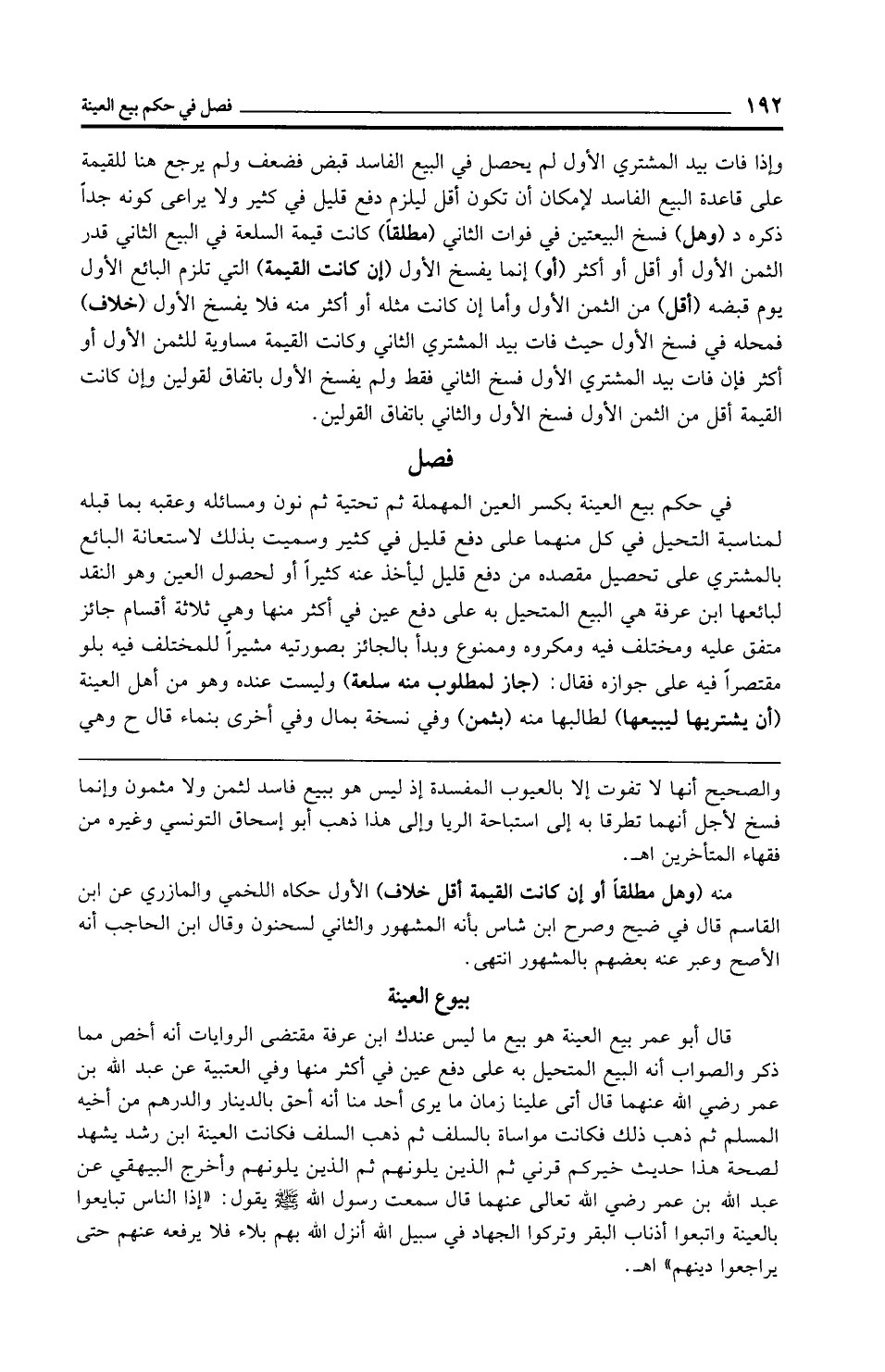 قال أبو عمر بيع العينة هو بيع ما ليس عندك ابن عرفة مقتضى الروايات أنه أخص مما ذكر والصواب أنه البيع المتحيل به على دفع عين في أكثر منها وفي العتبية عن عبد الله بن عمر رضي الله عنهما قال أتى علينا زمان ما يرى أحد منا أنه أحق بالدينار والدرهم من أخيه المسلم ثم ذهب ذلك فكانت مواساة بالسلف ثم ذهب السلف فكانت العينة ابن رشد يشهد لصحة هذا حديث خيركم قرني ثم الذين يلونهم ثم الذين يلونهم وأخرج البيهقي عن عبد الله بن عمر رضي الله تعالى عنهما قال سمعت رسول الله - صلى الله عليه وسلم - يقول: "إذا الناس تبايعوا بالعينة واتبعوا أذناب البقر وتركوا الجهاد في سبيل الله أنزل الله بهم بلاء فلا يرفعه عنهم حتى يراجعوا دينهم" اهـ.