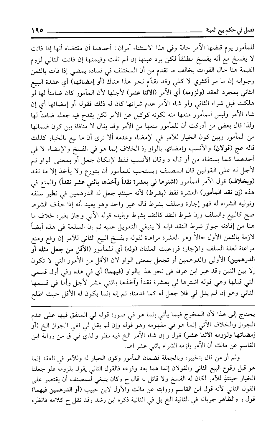 للمأمور يوم قبضها الآمر حالة وفي هذا الاستثناء أمران: أحدهما أن مقتضاه أنها إذا فاتت لا يفسخ مع أنه يفسخ مطلقًا لكن يرد عينها إن لم تفت وقيمتها إن فاتت الثاني لزوم القيمة هنا حال الفوات يخالف ما تقدم من أن المختلف في فساده يمضي إذا فات بالثمن وجوابه إن ما مر أكثري لا كلي وقد تقدّم نحو هذا هناك (أو إمضائها) أي عقدة البيع الثاني بمجرد العقد (ولزومه) أي الآمر (الاثنا عشر) لأجلها لأن المأمور كان ضامنًا لها لو هلكت قبل شراء الثاني ولو شاء الآمر عدم شرائها كان له ذلك فقوله أو إمضائها أي إن شاء الآمر وليس للمأمور منعها منه لكونه كوكيل عن الآمر لكن يقدح فيه جعله ضامنًا لها ولذا قال بعض من أدركت أن للمأمور منعها من الآمر وقد يقال لا منافاة بين كون ضمانها من المأمور وبين كون الخيار للآمر في الإمضاء وعدمه ألا ترى أن ما بيع بالخيار كذلك قاله عج (قولان) والإنسب وإمضائها بالواو إذ الخلاف إنما هو في الفسخ والإمضاء لا في أحدهما كما يستفاد من أو قاله د وقال الأنسب فقط لإمكان جعل أو بمعنى الواو ثم لأجل له على القولين قال المصنف ويستحب للمأمور أن يتورع ولا يأخذ إلا ما نقد (وبخلاف) قول الآمر للمأمور (اشترها لي بعشرة نقدًا وآخذها باثني عشر نقدًا) والمنع في هذه (إن نقد المأمور) العشرة فقط (بشرط) لأنه حينئذٍ جعل له الدرهمين في نظير سلفه وتوليه الشراء له فهو إجارة وسلف بشرط قاله غير واحد وهو يفيد أنه إذا حذف الشرط صح كالبيع والسلف وإن شرط النقد كالنقد بشرط ويفيده قوله الآتي وجاز بغيره خلاف ما هنا من إفادته جواز شرط النقد فإنه لا ينبغي التعويل عليه ثم إن السلعة في هذه أيضًا لازمة بالثمن الأول حالًا وهو العشرة مراعاة لقوله ويفسخ البيع الثاني للآمر إن وقع ومنع مراعاة لعلة السلف والإجارة فروعيت العلتان (وله) أي للمأمور (الأقل من جعل مثله أو الدرهمين) الأولى والدرهمين أو تجعل بمعنى الواو لأن الأقل من الأمور التي لا تكون إلا بين اثنين وقد عبر ابن عرفة في نحو هذا بالواو (فيهما) أي في هذه وفي أول قسمي التي قبلها وهي قوله اشترها لي بعشرة نقدًا وآخذها باثني عشر لأجل وأما في قسمها الثاني وهو إن لم يقل لي فلا جعل له كما قدمناه ثم إنه إنما يكون له الأقل حيث اطلع