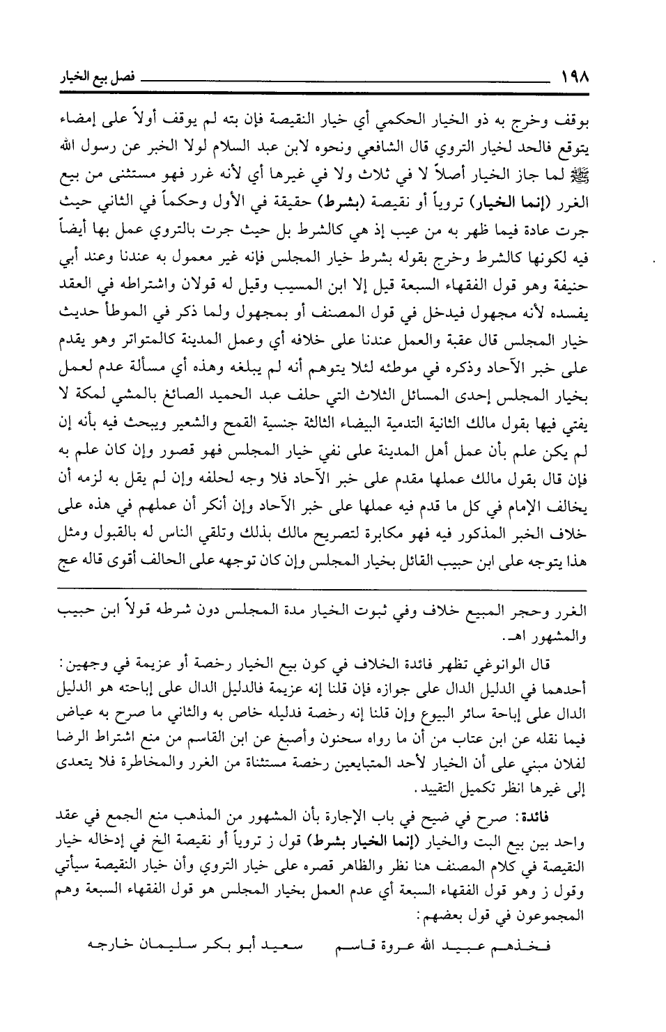 بوقف وخرج به ذو الخيار الحكمي أي خيار النقيصة فإن بته لم يوقف أولًا على إمضاء يتوقع فالحد لخيار التروي قال الشافعي ونحوه لابن عبد السلام لولا الخبر عن رسول الله - صلى الله عليه وسلم - لما جاز الخيار أصلًا لا في ثلاث ولا في غيرها أي لأنه غرر فهو مستثنى من بيع الغرر (إنما الخيار) ترويًا أو نقيصة (بشرط) حقيقة في الأول وحكمًا في الثاني حيث جرت عادة فيما ظهر به من عيب إذ هي كالشرط بل حيث جرت بالتروي عمل بها أيضًا فيه لكونها كالشرط وخرج بقوله بشرط خيار المجلس فإنه غير معمول به عندنا وعند أبي حنيفة وهو قول الفقهاء السبعة قيل إلا ابن المسيب وقيل له قولان واشتراطه في العقد يفسده لأنه مجهول فيدخل في قول المصنف أو بمجهول ولما ذكر في الموطأ حديث خيار المجلس قال عقبة والعمل عندنا على خلافه أي وعمل المدينة كالمتواتر وهو يقدم على خبر الآحاد وذكره في موطئه لئلا يتوهم أنه لم يبلغه وهذه أي مسألة عدم لعمل بخيار المجلس إحدى المسائل الثلاث التي حلف عبد الحميد الصائغ بالمشي لمكة لا يفتي فيها بقول مالك الثانية التدمية البيضاء الثالثة جنسية القمح والشعير ويبحث فيه بأنه إن لم يكن علم بأن عمل أهل المدينة على نفي خيار المجلس فهو قصور وإن كان علم به فإن قال يقول مالك عملها مقدم على خبر الآحاد فلا وجه لحلفه وإن لم يقل به لزمه أن يخالف الإمام في كل ما قدم فيه عملها على خبر الآحاد وإن أنكر أن عملهم في هذه على خلاف الخبر المذكور فيه فهو مكابرة لتصريح مالك بذلك وتلقي الناس له بالقبول ومثل هذا يتوجه على ابن حبيب القائل بخيار المجلس وإن كان توجهه على الحالف أقوى قاله عج