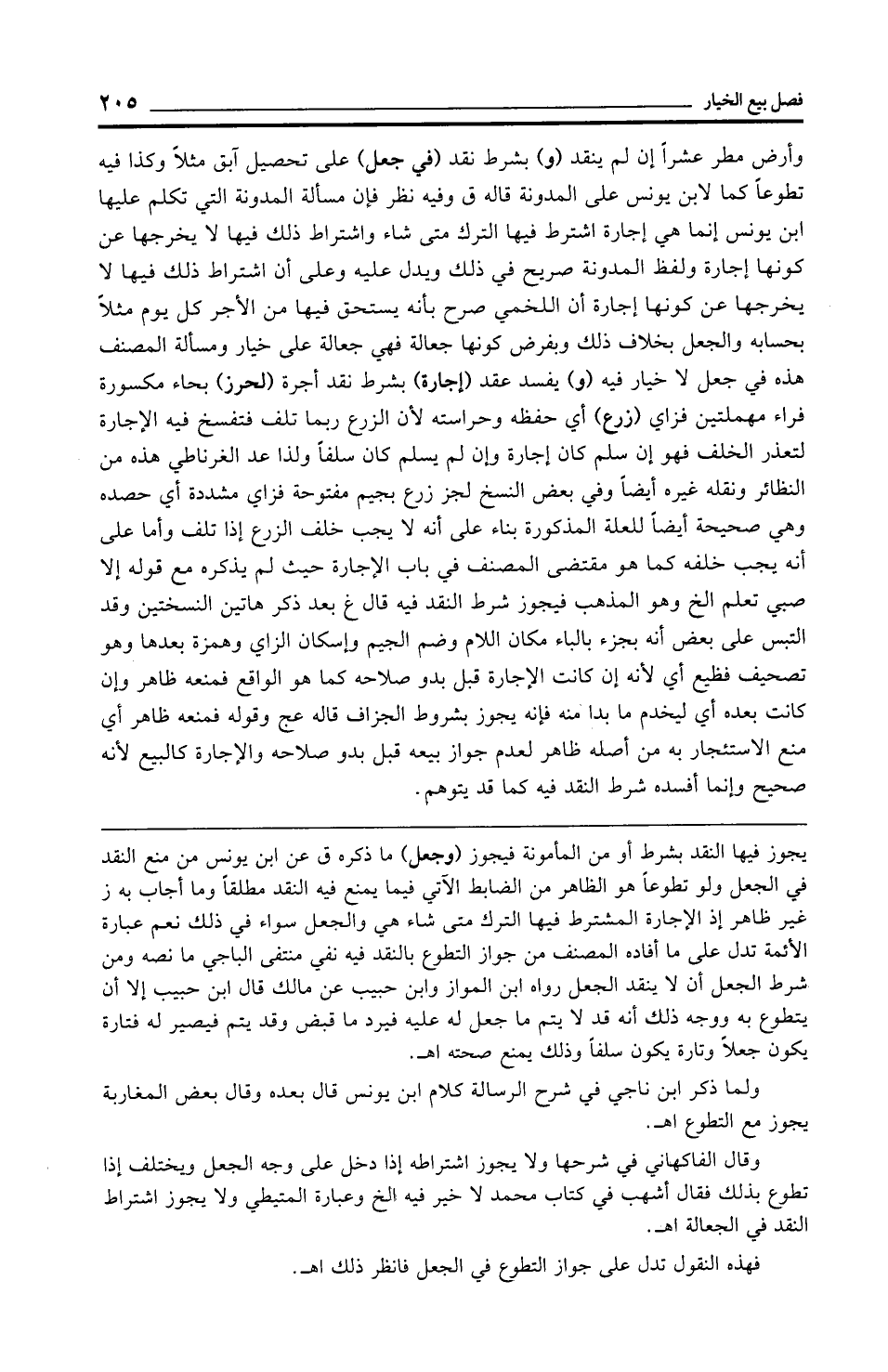 وقال الفاكهاني في شرحها ولا يجوز اشتراطه إذا دخل على وجه الجعل ويختلف إذا تطوع بذلك فقال أشهب في كتاب محمَّد لا خير فيه الخ وعبارة المتيطي ولا يجوز اشتراط النقد في الجعالة اهـ.