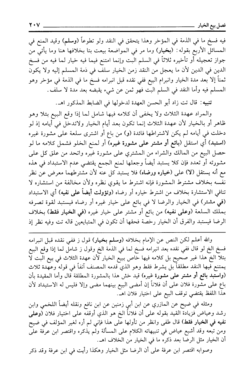 والله أعلم لكن النص عن الإمام بخلافه (وسلم بخيار) قول ز ففي نقده قبل انبرامه فسخ الخ لو قال ففي نقده بعد انبرامه فسخ لما في الذمة الخ وقول ز شامل لما إذا وقع البيع بتلا الخ هذا غير صحيح بل كلامه فيها خاص ببيع الخيار لأن عهدة الثلاث في بيع البت لا يمتنع فيها النقد مطلقًا بل يشرط فقط وهو الذي قدمه المصنف آنفًا في قوله وعهدة ثلاث (واستبد بائع أو مشتر على مشورة غيره) قيد خش هذا بالمشورة المطلقة قال وأما المقيدة بأن باع على مشورة فلان على أن فلانًا إن أمضى البيع بينهما مضى وإلا فليس له الاستبداد لأن هذا اللفظ يقتضي توقف البيع على اختيار فلان اهـ.