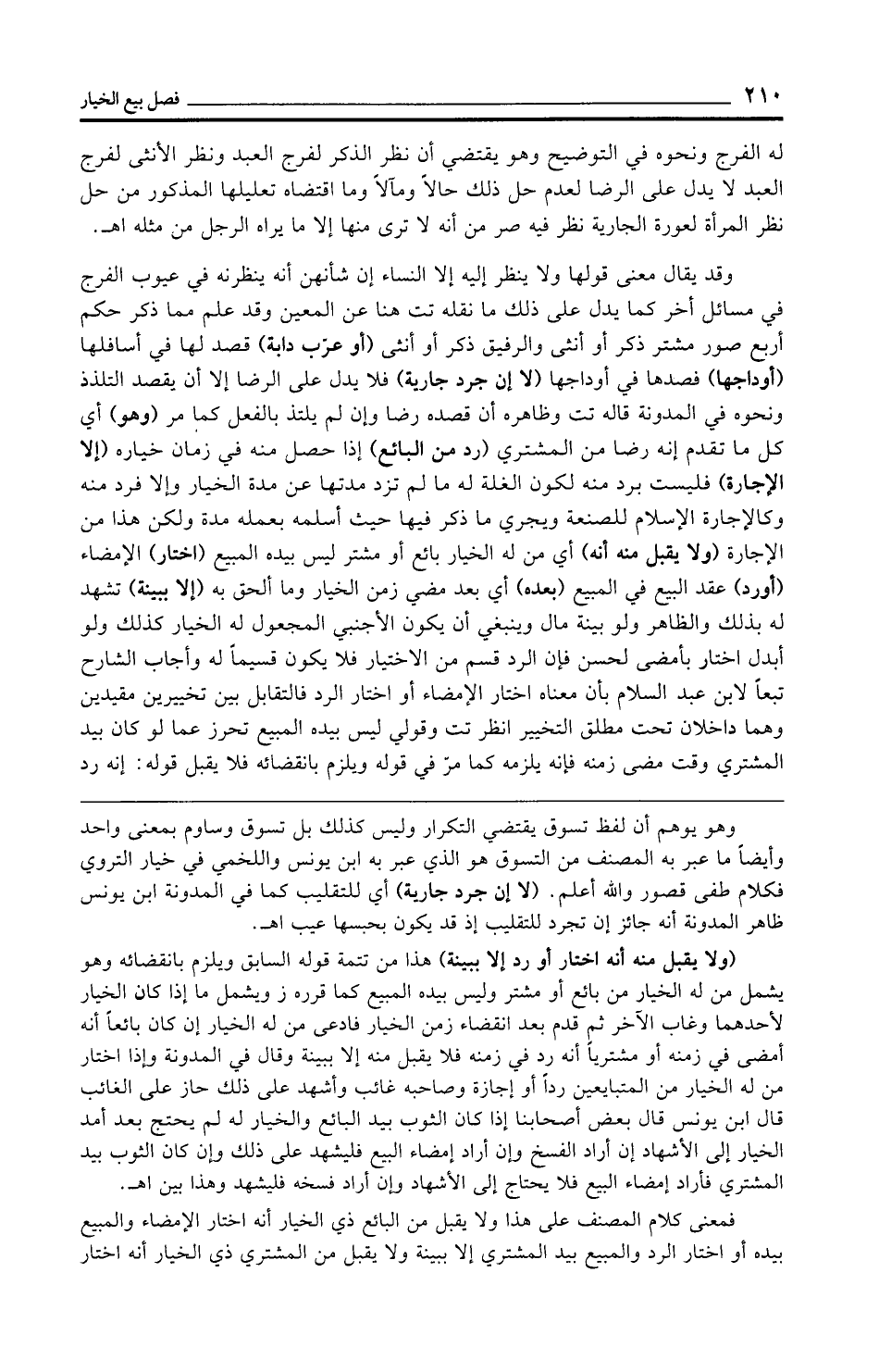 وقد يقال معنى قولها ولا ينظر إليه إلا النساء إن شأنهن أنه ينظرنه في عيوب الفرج في مسائل أخر كما يدل على ذلك ما نقله تت هنا عن المعين وقد علم مما ذكر حكم أربع صور مشتر ذكر أو أنثى والرفيق ذكر أو أنثى (أو عرّب دابة) قصد لها في أسافلها (أوداجها) فصدها في أوداجها (لا إن جرد جارية) فلا يدل على الرضا إلا أن يقصد التلذذ ونحوه في المدونة قاله تت وظاهره أن قصده رضا وإن لم يلتذ بالفعل كما مر (وهو) أي كل ما تقدم إنه رضا من المشتري (رد من البائع) إذا حصل منه في زمان خياره (إلا الإجارة) فليست برد منه لكون الغلة له ما لم تزد مدتها عن مدة الخيار وإلا فرد منه وكالإجارة الإسلام للصنعة ويجري ما ذكر فيها حيث أسلمه بعمله مدة ولكن هذا من الإجارة (ولا يقبل منه أنه) أي من له الخيار بائع أو مشتر ليس بيده المبيع (اختار) الإمضاء (أورد) عقد البيع في المبيع (بعده) أي بعد مضي زمن الخيار وما ألحق به (إلا ببينة) تشهد له بذلك والظاهر ولو بينة مال وينبغي أن يكون الأجنبي المجعول له الخيار كذلك ولو أبدل اختار بأمضى لحسن فإن الرد قسم من الاختيار فلا يكون قسيمًا له وأجاب الشارح تبعًا لابن عبد السلام بأن معناه اختار الإمضاء أو اختار الرد فالتقابل بين تخييرين مقيدين وهما داخلان تحت مطلق التخيير انظر تت وقولي ليس بيده المبيع تحرز عما لو كان بيد المشتري وقت مضى زمنه فإنه يلزمه كما مرّ في قوله ويلزم بانقضائه فلا يقبل قوله: إنه رد