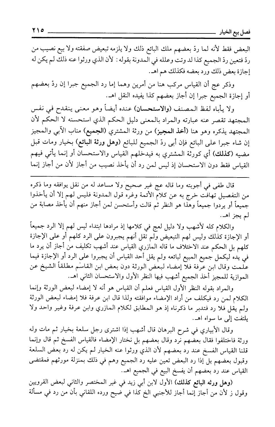 وقال الأبياري في شرح البرهان قال أشهب إذا اشترى رجل سلعة بخيار ثم مات وله ورثة فاختلفوا فقال بعضهم نرد وقال بعضهم بل نختار الإمضاء فالقياس الفسخ ثم قال وإنما قلنا القياس الفسخ عند رد بعضهم لأن الذي ورثوا عنه الخيار لم يكن له رد بعض السلعة وقبول بعضهم بل إذا رد البعض تعين عليه رد الجميع وهم في ذلك بمنزلة مورثهم فمقتضى القياس عند رد بعضهم أن يفسخ البيع في الجميع اهـ.