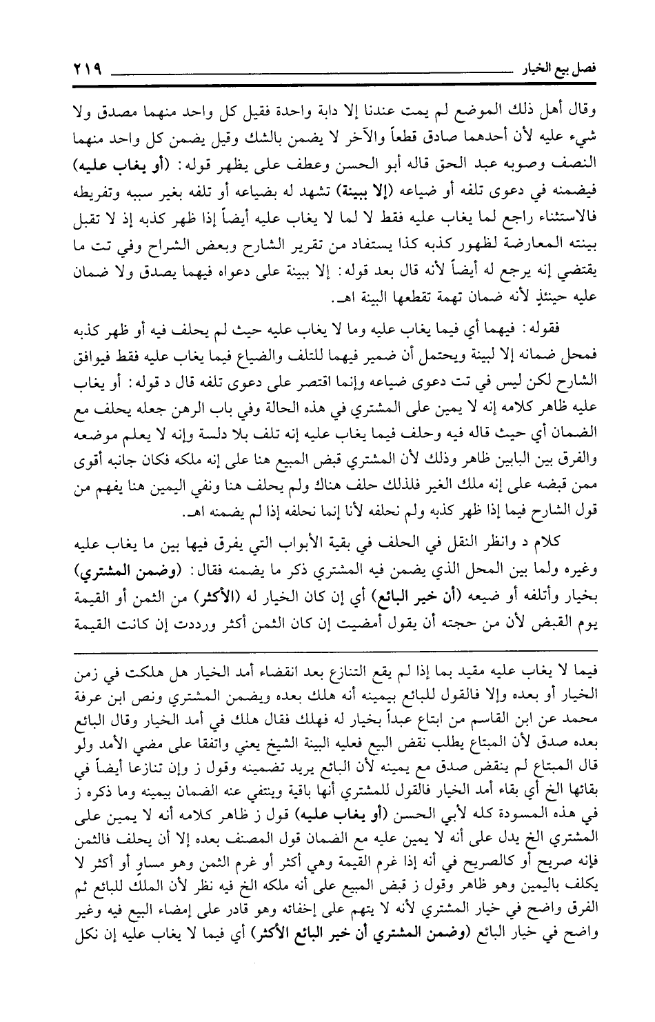 كلام د وانظر النقل في الحلف في بقية الأبواب التي يفرق فيها بين ما يغاب عليه وغيره ولما بين المحل الذي يضمن فيه المشتري ذكر ما يضمنه فقال: (وضمن المشتري) بخيار وأتلفه أو ضيعه (أن خير البائع) أي إن كان الخيار له (الأكثر) من الثمن أو القيمة يوم القبض لأن من حجته أن يقول أمضيت إن كان الثمن أكثر ورددت إن كانت القيمة