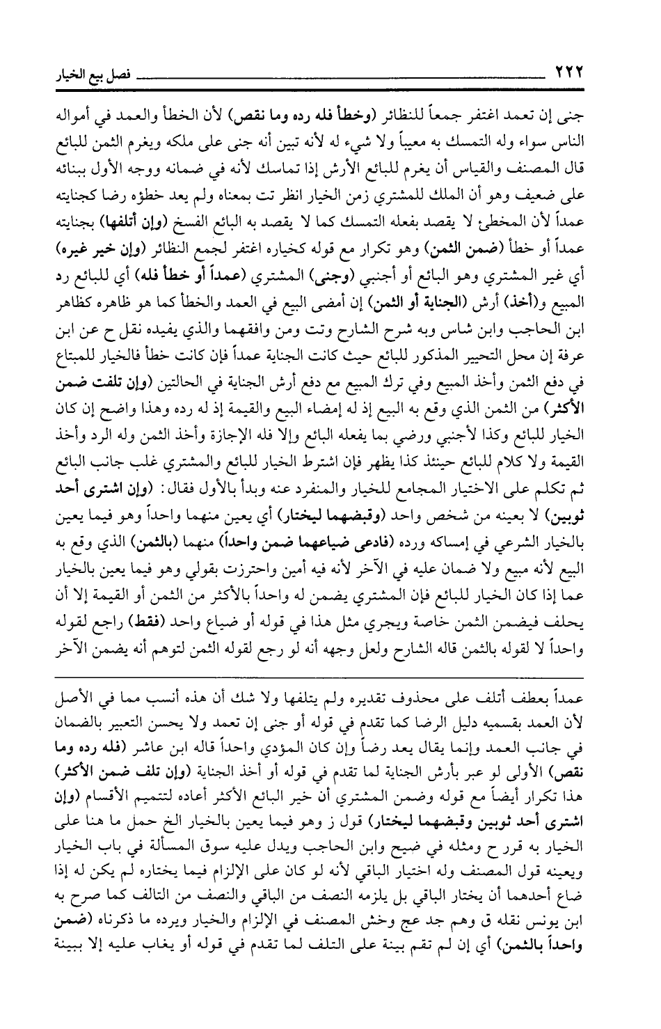 جنى إن تعمد اغتفر جمعًا للنظائر (وخطأ فله رده وما نقص) لأن الخطأ والعمد في أمواله الناس سواء وله التمسك به معيبًا ولا شيء له لأنه تبين أنه جنى على ملكه ويغرم الثمن للبائع قال المصنف والقياس أن يغرم للبائع الأرش إذا تماسك لأنه في ضمانه ووجه الأول ببنائه على ضعيف وهو أن الملك للمشتري زمن الخيار انظر تت بمعناه ولم يعد خطؤه رضا كجنايته عمدًا لأن المخطيء لا يقصد بفعله التمسك كما لا يقصد به البائع الفسخ (وإن أتلفها) بجنايته عمدًا أو خطأ (ضمن الثمن) وهو تكرار مع قوله كخياره اغتفر لجمع النظائر (وإن خير غيره) أي غير المشتري وهو البائع أو أجنبي (وجنى) المشتري (عمدًا أو خطأ فله) أي للبائع رد المبيع و (أخذ) أرش (الجناية أو الثمن) إن أمضى البيع في العمد والخطأ كما هو ظاهره كظاهر ابن الحاجب وابن شاس وبه شرح الشارح وتت ومن وافقهما والذي يفيده نقل ح عن ابن عرفة إن محل التحيير المذكور للبائع حيث كانت الجناية عمدًا فإن كانت خطأ فالخيار للمبتاع في دفع الثمن وأخذ المبيع وفي ترك المبيع مع دفع أرش الجناية في الحالتين (وإن تلفت ضمن الأكثر) من الثمن الذي وقع به البيع إذ له إمضاء البيع والقيمة إذ له رده وهذا واضح إن كان الخيار للبائع وكذا لأجنبي ورضي بما يفعله البائع وإلا فله الإجازة وأخذ الثمن وله الرد وأخذ القيمة ولا كلام للبائع حينئذ كذا يظهر فإن اشترط الخيار للبائع والمشتري غلب جانب البائع ثم تكلم على الاختيار المجامع للخيار والمنفرد عنه وبدأ بالأول فقال: (وإن اشترى أحد ثوبين) لا بعينه من شخص واحد (وقبضهما ليختار) أي يعين منهما واحدًا وهو فيما يعين بالخيار الشرعي في إمساكه ورده (فادعى ضياعهما ضمن واحدًا) منهما (بالثمن) الذي وقع به البيع لأنه مبيع ولا ضمان عليه في الآخر لأنه فيه أمين واحترزت بقولي وهو فيما يعين بالخيار عما إذا كان الخيار للبائع فإن المشتري يضمن له واحدًا بالأكثر من الثمن أو القيمة إلا أن يحلف فيضمن الثمن خاصة ويجري مثل هذا في قوله أو ضياع واحد (فقط) راجع لقوله واحدًا لا لقوله بالثمن قاله الشارح ولعل وجهه أنه لو رجع لقوله الثمن لتوهم أنه يضمن الآخر