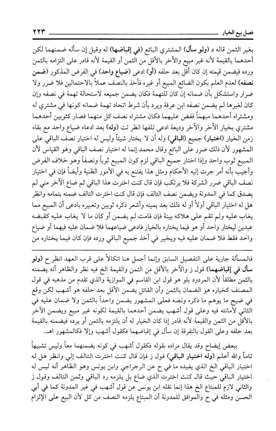 بغير الثمن قاله د (ولو سأل) المشتري البائع (في إقباضها) له وقيل إن سأله ضمنهما لكن أحدهما بالقيمة لأنه غير مبيع والآخر بالأقل من الثمن أو القيمة لأنه قادر على التزامه بالثمن ورده فيضمن قيمته إن كان أقل بعد حلفه (أو) ادعى (ضياع واحد) في الفرض المذكور (ضمن نصفه) لعدم العلم بكون الضائع المبيع أو غيره فأخذ بالنصف عملًا بالاحتمالين فلا ضرر ولا ضرار واستشكل بأن ضمانه إن كان للتهمة فكان يضمن جميعه لاستحالة تهمة في نصفه وإن كان لغيرها لم يضمن نصفه ابن عرفة ويرد بأن شرط اتحاد تهمة ضمانه كونها في مشتري له ومشتراه أحدهما مبهمًا ففض عليهما فكان مشتراه نصف كل منهما فصار كثوبين أحدهما مشتري بخيار الآخر والآخر وديعة ادعى تلفها انظر تت (وله) بعد ادعاء ضياع واحد مع بقاء زمن الخيار (اختيار) جميع (الباقي) وله أن لا يختار شيئًا وليس له اختيار نصف الباقي على المشهور لأن ذلك ضرر على البائع وقال محمد إنما له اختيار نصف الباقي وهو القياس لأن المبيع ثوب واحد وإذا اختار جميع الباقي لزم كون المبيع ثوبًا ونصفًا وهو خلاف الفرض وأجيب بأنه أمر جرت إليه الأحكام ومثل هذا يقتنع به في الأمور الظنية وأيضًا فإن في اختيار نصف الباقي ضرر الشركة فلا يرتكب فإن قال كنت اخترت هذا الباقي ثم ضاع الآخر مني لم يصدق كما في المدونة ويضمن نصف التالف فإن قال كنت اخترت التالف ضمنه بتمامه وانظر هل له اختيار الباقي أولًا أو له ذلك بعد يمينه وأشعر ذكره ثوبين وتعبيره بادعى أن المبيع مما يغاب عليه ولم تقم على هلاكه بينة فإن قامت لم يضمن أو كان ما لا يغاب عليه كقبضه عبدين ليختار واحد أو هو فيما يختاره بالخيار فادعى ضياعهما فلا ضمان عليه فيهما أو ضياع واحد فقط فلا ضمان عليه فيه ويخير في أخذ جميع الباقي ورده فإن كان فيما يختاره من