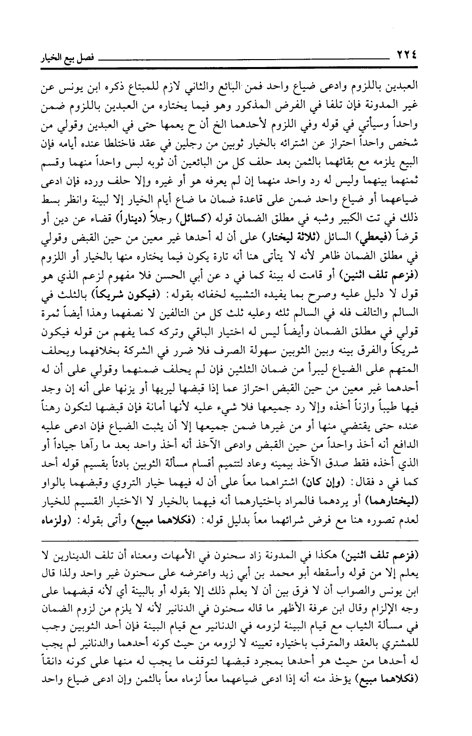 العبدين باللزوم وادعى ضياع واحد فمن البائع والثاني لازم للمبتاع ذكره ابن يونس عن غير المدونة فإن تلفا في الفرض المذكور وهو فيما يختاره من العبدين باللزوم ضمن واحدًا وسيأتي في قوله وفي اللزوم لأحدهما الخ أن ح يعمها حتى في العبدين وقولي من شخص واحدًا احتراز عن اشترائه بالخيار ثوبين من رجلين في عقد فاختلطا عنده أيامه فإن البيع يلزمه مع بقائهما بالثمن بعد حلف كل من البائعين أن ثوبه لبس واحدًا منهما وقسم ثمنهما بينهما وليس له رد واحد منهما إن لم يعرفه هو أو غيره وإلا حلف ورده فإن ادعى ضياعهما أو ضياع واحد ضمن على قاعدة ضمان ما ضاع أيام الخيار إلا لبينة وانظر بسط ذلك في تت الكبير وشبه في مطلق الضمان قوله (كسائل) رجلًا (دينارًا) قضاء عن دين أو قرضًا (فيعطي) السائل (ثلاثة ليختار) على أن له أحدها غير معين من حين القبض وقولي في مطلق الضمان ظاهر لأنه لا يتأتى هنا أنه تارة يكون فيما يختاره منها بالخيار أو اللزوم (فزعم تلف اثنين) أو قامت له بينة كما في د عن أبي الحسن فلا مفهوم لزعم الذي هو قول لا دليل عليه وصرح بما يفيده التشبيه لخفائه بقوله: (فيكون شريكًا) بالثلث في السالم والتالف فله في السالم ثلثه وعليه ثلث كل من التالفين لا نصفهما وهذا أيضًا ثمرة قولي في مطلق الضمان وأيضًا ليس له اختيار الباقي وتركه كما يفهم من قوله فيكون شريكًا والفرق بينه وبين الثوبين سهولة الصرف فلا ضرر في الشركة بخلافهما ويحلف المتهم على الضياع ليبرأ من ضمان الثلثين فإن لم يحلف ضمنهما وقولي على أن له أحدهما غير معين من حين القبض احتراز عما إذا قبضها ليريها أو يزنها على أنه إن وجد فيها طيبًا وازنًا أخذه وإلا رد جميعها فلا شيء عليه لأنها أمانة فإن قبضها لتكون رهنًا عنده حتى يقتضي منها أو من غيرها ضمن جميعها إلا أن يثبت الضياع فإن ادعى عليه الدافع أنه أخذ واحدًا من حين القبض وادعى الآخذ أنه أخذ واحد بعد ما رآها جيادًا أو الذي أخذه فقط صدق الآخذ بيمينه وعاد لتتميم أقسام مسألة الثوبين بادئًا بقسيم قوله أحد كما في د فقال: (وإن كان) اشتراهما معًا على أن له فيهما خيار التروي وقبضهما بالواو (ليختارهما) أو يردهما فالمراد باختيارهما أنه فيهما بالخيار لا الاختيار القسيم للخيار لعدم تصوره هنا مع فرض شرائهما معًا بدليل قوله: (فكلاهما مبيع) وأتى بقوله: (ولزماه