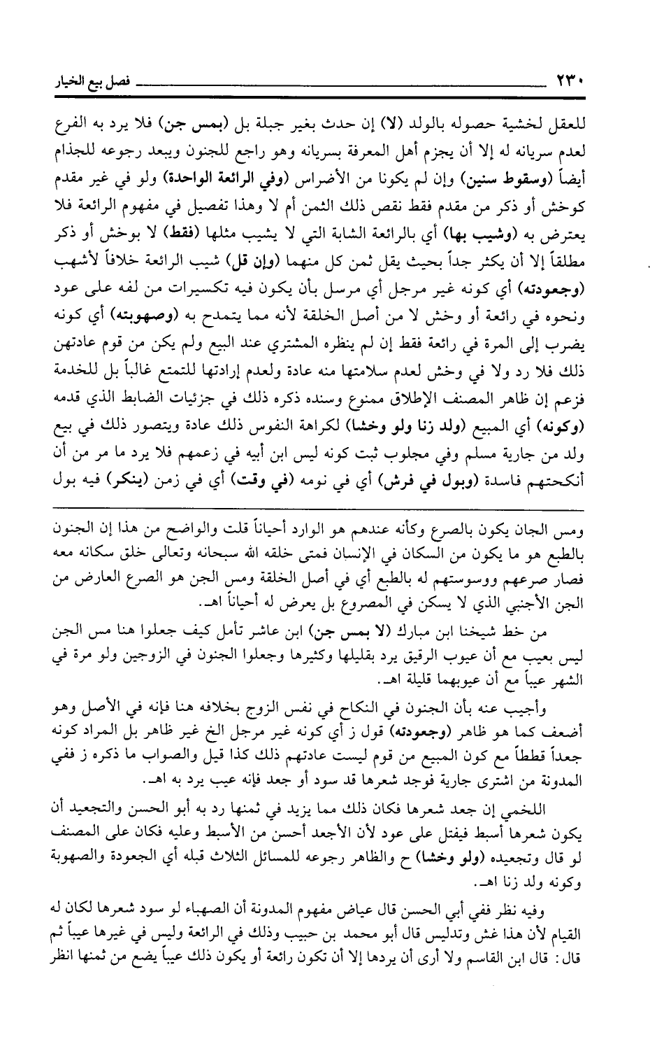 من خط شيخنا ابن مبارك (لا بمس جن) ابن عاشر تأمل كيف جعلوا هنا مس الجن ليس بعيب مع أن عيوب الرقيق يرد بقليلها وكثيرها وجعلوا الجنون في الزوجين ولو مرة في الشهر عيبًا مع أن عيوبهما قليلة اهـ.
