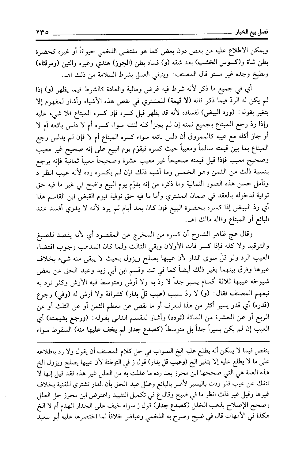 وقال عج ظاهر الشارح أن كسره من المخرج عن المقصود أي لأنه يقصد للصبغ والترقيد ولا كله فإذا كسر فات الأولان وبقي الثالث ولما كان المذهب وجوب اقتضاء العيب الرد ولو قلّ سوى الدار لأن عيبها يصلح ويزول بحيث لا يبقى منه شيء بخلاف غيرها وفرق بينهما بغير ذلك أيضًا كما في تت وقسم ابن أبي زيد وعبد الحق عن بعض شيوخه عيبها ثلاثة أقسام يسير جدًّا لا ردّ به ولا أرش ومتوسط فيه الأرش وكثر ترد به تبعهم المصنف فقال: (و) لا ردّ بسبب (عيب قلّ بدار) كشرافة ولا أرش له (وفي) رجوع (قدره) أي قدر يسير أكثر من هذا للعرف أو ما نقص عن معظم الثمن أو عن الثلث أو عن الربع أو عن العشرة من المائة (تردد) وأشار للقسم الثاني بقوله: (ورجع بقيمته) أي العيب إن لم يكن يسيرًا جدًّا بل متوسطًا (كصدع جدار لم يخف عليها منه) السقوط سواء