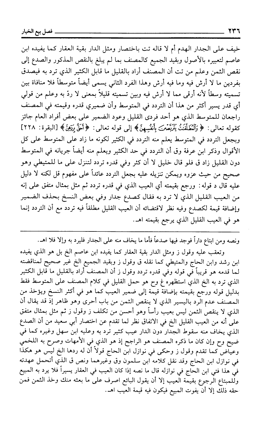 خيف على الجدار الهدم أم لا قاله تت باختصار ومثل الدار بقية العقار كما يفيده ابن عاصم لتعبيره بالأصول وبقيد الجميع كالمصنف بما لم يبلغ بالنقص المذكورة والصدع إلى نقص الثمن وعلم من تت أن المصنف أراد بالقليل ما قابل الكثير الذي ترد به فيصدق بفردين ما لا أرش فيه وما فيه أرش وهذا الفرد الثاني يسمى أيضًا متوسطًا فلا منافاة بين تسميته وسطًا لأنه أرقى مما لا أرش فيه وبين تسميته قليلًا بمعنى لا ردّ به وعلم من قولي أي قدر يسير أكثر من هذا أن التردد في المتوسط وأن ضميري قدره وقيمته في المصنف راجعان للمتوسط الذي هو أحد فردى القليل وعود الضمير على بعض أفراد العام جائز كقوله تعالى: {وَالْمُطَلَّقَاتُ يَتَرَبَّصْنَ بِأَنْفُسِهِنَّ} إلى قوله تعالى: {أَحَقُّ بِرَدِّهِنَّ} [البقرة: 228] وبجعل التردد في المتوسط يعلم منه التردد في الكثير لكونه ما زاد على المتوسط على كل الأقوال وذكر ابن عرفة وق أن التردد في حد الكثير ويعلم منه أيضًا جريانه في المتوسط دون القليل زاد ق فلو قال خليل لا أن كثر وفي قدره تردد لتنزل على ما للمتيطي وهو صحيح من حيث عزوه ويمكن تنزيله عليه بجعل التردد عائدًا على مفهوم قل لكنه لا دليل عليه قال د قوله: ورجع بقيمته أي العيب الذي في قدره تردد ثم مثل بمثال متفق على إنه من العيب القليل الذي لا ترد به فقال كصدع جدار وفي بعض النسخ بحذف الضمير وإضافة قيمة لكصدع وفيه نظر لاقتضائه أن العيب القليل مطلقًا فيه تردد مع أن التردد إنما هو في العيب القليل الذي يرجع بقيمته اهـ.