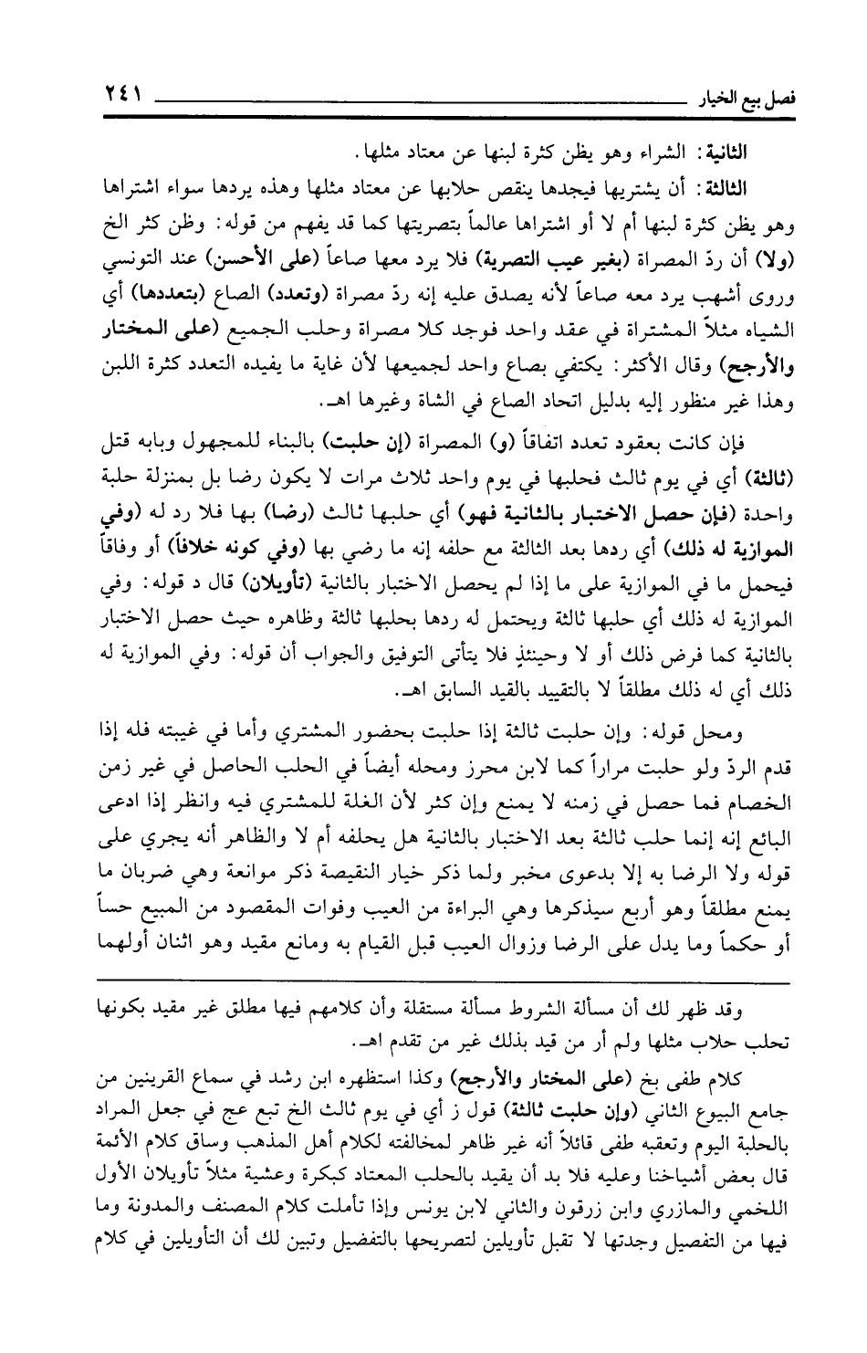 كلام طفى بخ (على المختار والأرجح) وكذا استظهره ابن رشد في سماع القرينين من جامع البيوع الثاني (وإن حلبت ثالثة) قول ز أي في يوم ثالث الخ تبع عج في جعل المراد بالحلبة اليوم وتعقبه طفى قائلًا أنه غير ظاهر لمخالفته لكلام أهل المذهب وساق كلام الأئمة قال بعض أشياخنا وعليه فلا بد أن يقيد بالحلب المعتاد كبكرة وعشية مثلًا تأويلان الأول اللخمي والمازري وابن زرقون والثاني لابن يونس وإذا تاملت كلام المصنف والمدونة وما فيها من التفصيل وجدتها لا تقبل تأويلين لتصريحها بالتفضيل وتبين لك أن التأويلين في كلام