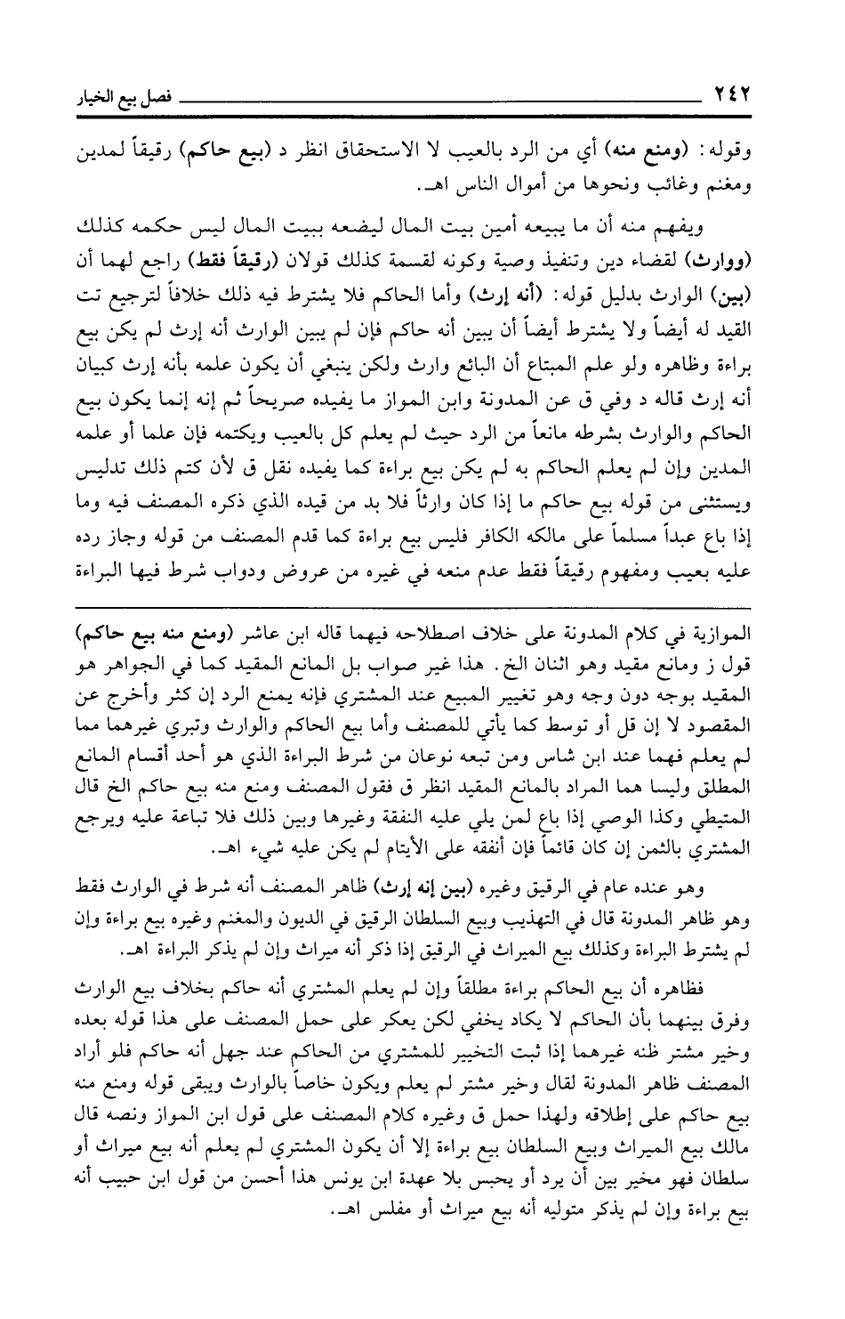 فظاهره أن بيع الحاكم براءة مطلقًا وإن لم يعلم المشتري أنه حاكم بخلاف بيع الوارث وفرق بينهما بأن الحاكم لا يكاد يخفي لكن يعكر على حمل المصنف على هذا قوله بعده وخير مشتر ظنه غيرهما إذا ثبت التخيير للمشتري من الحاكم عند جهل أنه حاكم فلو أراد المصنف ظاهر المدونة لقال وخير مشتر لم يعلم ويكون خاصًّا بالوارث ويبقى قوله ومنع منه بيع حاكم على إطلاقه ولهذا حمل ق وغيره كلام المصنف على قول ابن المواز ونصه قال مالك بيع الميراث وبيع السلطان بيع براءة إلا أن يكون المشتري لم يعلم أنه بيع ميراث أو سلطان فهو مخير بين أن يرد أو يحبس بلا عهدة ابن يونس هذا أحسن من قول ابن حبيب أنه بيع براءة وإن لم يذكر متوليه أنه بيع ميراث أو مفلس اهـ.
