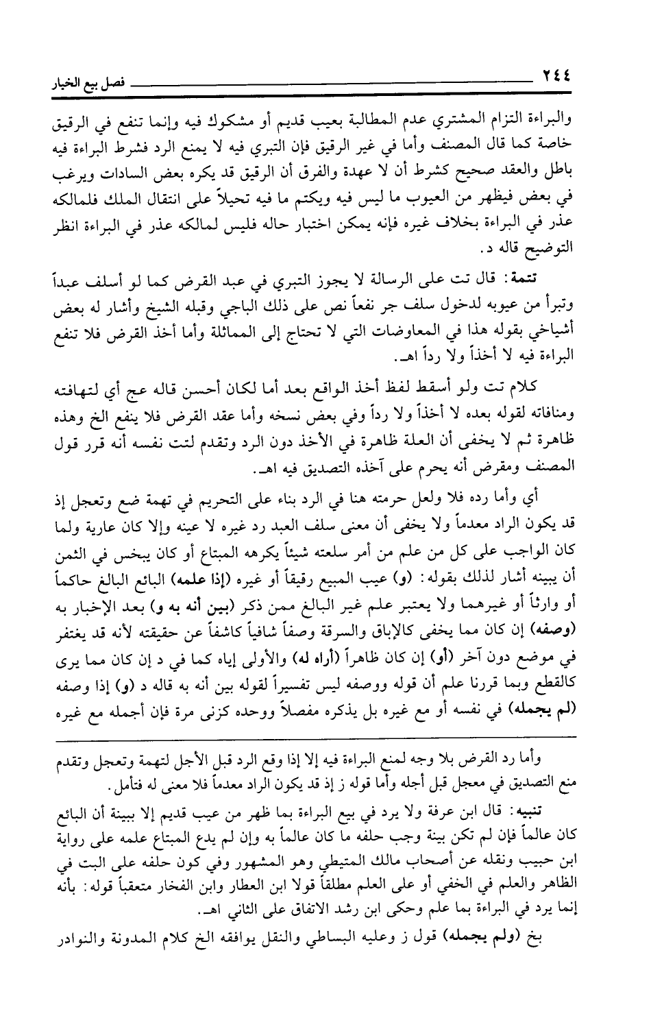 تتمة: قال تت على الرسالة لا يجوز التبري في عبد القرض كما لو أسلف عبدًا وتبرأ من عيوبه لدخول سلف جر نفعًا نص على ذلك الباجي وقبله الشيخ وأشار له بعض أشياخي بقوله هذا في المعاوضات التي لا تحتاج إلى المماثلة وأما أخذ القرض فلا تنفع البراءة فيه لا أخذًا ولا ردًّا اهـ.