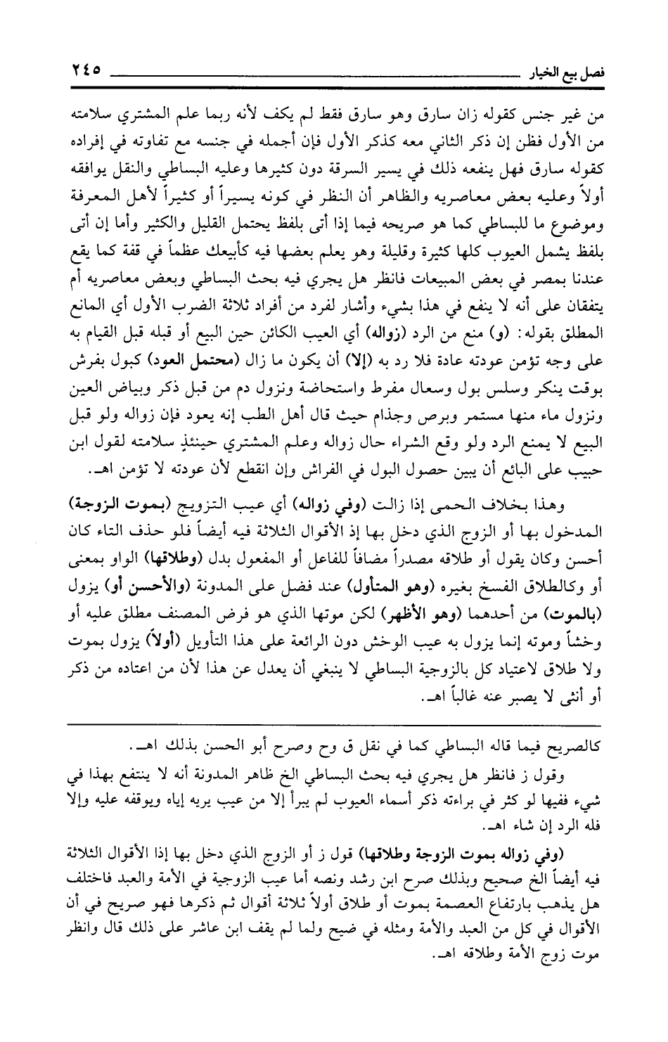 من غير جنس كقوله زان سارق وهو سارق فقط لم يكف لأنه ربما علم المشتري سلامته من الأول فظن إن ذكر الثاني معه كذكر الأول فإن أجمله في جنسه مع تفاوته في إفراده كقوله سارق فهل ينفعه ذلك في يسير السرقة دون كثيرها وعليه البساطي والنقل يوافقه أولًا وعليه بعض معاصريه والظاهر أن النظر في كونه يسيرًا أو كثيرًا لأهل المعرفة وموضوع ما للبساطي كما هو صريحه فيما إذا أتى بلفظ يحتمل القليل والكثير وأما إن أتى بلفظ يشمل العيوب كلها كثيرة وقليلة وهو يعلم بعضها فيه كأبيعك عظمًا في قفة كما يقع عندنا بمصر في بعض المبيعات فانظر هل يجري فيه بحث البساطي وبعض معاصريه أم يتفقان على أنه لا ينفع في هذا بشيء وأشار لفرد من أفراد ثلاثة الضرب الأول أي المانع المطلق بقوله: (و) منع من الرد (زواله) أي العيب الكائن حين البيع أو قبله قبل القيام به على وجه تؤمن عودته عادة فلا رد به (إلا) أن يكون ما زال (محتمل العود) كبول بفرش بوقت ينكر وسلس بول وسعال مفرط واستحاضة ونزول دم من قبل ذكر وبياض العين ونزول ماء منها مستمر وبرص وجذام حيث قال أهل الطب إنه يعود فإن زواله ولو قبل البيع لا يمنع الرد ولو وقع الشراء حال زواله وعلم المشتري حينئذ سلامته لقول ابن حبيب على البائع أن يبين حصول البول في الفراش وإن انقطع لأن عودته لا تؤمن اهـ.