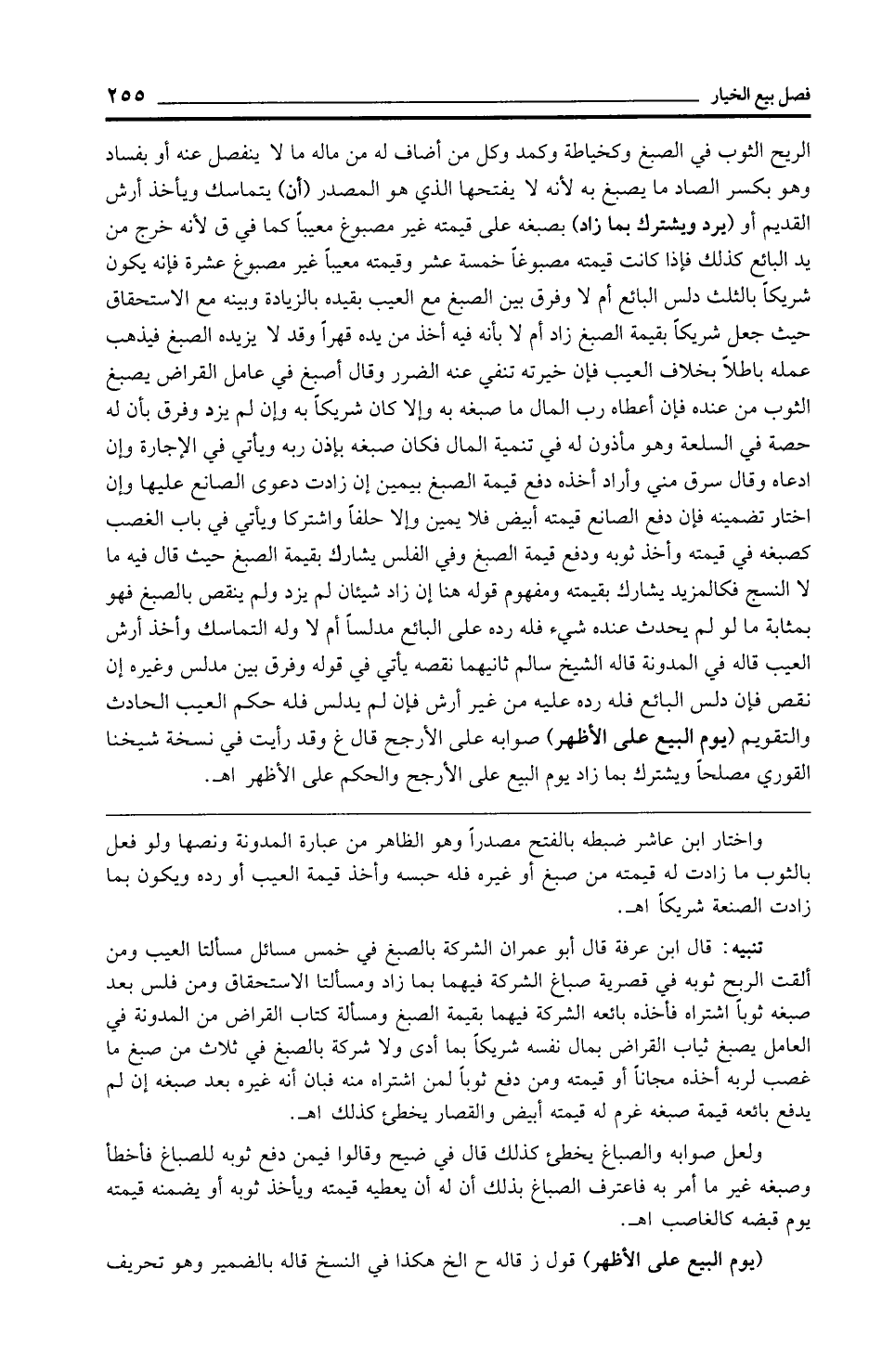 الريح الثوب في الصبغ وكخياطة وكمد وكل من أضاف له من ماله ما لا ينفصل عنه أو بفساد وهو بكسر الصاد ما يصبغ به لأنه لا يفتحها الذي هو المصدر (أن) يتماسك ويأخذ أرش القديم أو (يرد ويشترك بما زاد) بصبغه على قيمته غير مصبوغ معيبًا كما في ق لأنه خرج من يد البائع كذلك فإذا كانت قيمته مصبوغًا خمسة عشر وقيمته معيبًا غير مصبوغ عشرة فإنه يكون شريكًا بالثلث دلس البائع أم لا وفرق بين الصبغ مع العيب بقيده بالزيادة وبينه مع الاستحقاق حيث جعل شريكًا بقيمة الصبغ زاد أم لا بأنه فيه أخذ من يده قهرًا وقد لا يزيده الصبغ فيذهب عمله باطلًا بخلاف العيب فإن خيرته تنفي عنه الضرر وقال أصبغ في عامل القراض يصبغ الثوب من عنده فإن أعطاه رب المال ما صبغه به وإلا كان شريكًا به وإن لم يزد وفرق بأن له حصة في السلعة وهو مأذون له في تنمية المال فكان صبغه بإذن ربه ويأتي في الإجارة وإن ادعاه وقال سرق مني وأراد أخذه دفع قيمة الصبغ بيمين إن زادت دعوى الصانع عليها وإن اختار تضمينه فإن دفع الصانع قيمته أبيض فلا يمين وإلا حلفًا واشتركا ويأتي في باب الغصب كصبغه في قيمته وأخذ ثوبه ودفع قيمة الصبغ وفي الفلس يشارك بقيمة الصبغ حيث قال في ما لا النسج فكالمزيد يشارك بقيمته ومفهوم قوله هنا إن زاد شيئان لم يزد ولم ينقص بالصبغ فهو بمثابة ما لو لم يحدث عنده شيء فله رده على البائع مدلسًا أم لا وله التماسك وأخذ أرش العيب قاله في المدونة قاله الشيخ سالم ثانيهما نقصه يأتي في قوله وفرق بين مدلس وغيره إن نقص فإن دلس البائع فله رده عليه من غير أرش فإن لم يدلس فله حكم العيب الحادث والتقويم (يوم البيع على الأظهر) صوابه على الأرجح قال غ وقد رأيت في نسخة شيخنا القوري مصلحًا ويشترك بما زاد يوم البيع على الأرجح والحكم على الأظهر اهـ.