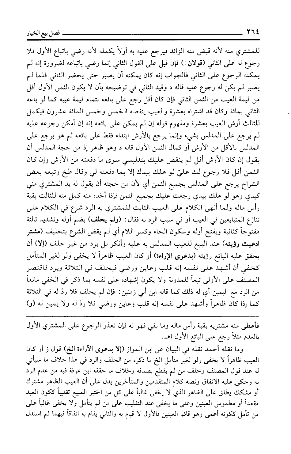 للمشتري منه لأنه قبض منه الزائد فيرجع عليه به أولًا يكمله لأنه رضي باتباع الأول فلا رجوع له على الثاني (قولان:) فإن قيل على القول الثاني إنما رضي باتباعه لضرورة إنه لم يمكنه الرجوع على الثاني فالجواب إنه كان يمكنه أن يصبر حتى يحضر الثاني فلما لم يصبر لم يكن له رجوع عليه قاله د وقيد الثاني في توضيحه بأن لا يكون الثمن الأول أقل من قيمة العيب من الثمن الثاني فإن كان أقل رجع على بائعه بتمام قيمة عيبه كما لو باعه الثاني بمائة وكان قد اشتراه بعشرة والعيب ينقصه الخمس وخمس المائة عشرون فيكمل للثالث أرش العيب بعشرة ومفهوم قوله إن لم يمكن على بائعه إنه إن أمكن رجوعه عليه لم يرجع على المدلس بشيء وإنما يرجع بالأرش ابتداء فقط على بائعه ثم هو يرجع على المدلس بالأقل من الأرش أو كمال الثمن الأول قاله د وهو ظاهر إذ من حجة المدلس أن يقول إن كان الأرش أقل لم ينقص عليك بتدليسي سوى ما دفعته من الأرش وإن كان الثمن أقل فلا رجوع لك علي لو هلك ببدك إلا بما دفعته لي وقال طخ وتبعه بعض الشراح يرجع على المدلس بجميع الثمن أي لأن من حجته أن يقول له يد المشتري مني كيدي وهو لو هلك بيدي رجعت عليك بجميع الثمن فإذا أخذه منه كمل منه للثالث بقية رأس ماله ولما أنهى الكلام على العيب الثابت للمشتري به الرد شرع في الكلام على تنازع المتبايعين في العيب أو في سبب الرد به فقال: (ولم يحلف) بضم أوله وتشديد ثالثة مفتوحًا كثانية وبفتح أوله وسكون الحاء وكسر اللام أي لم يقض الشرع بتحليف (مشتر ادعيت رؤيته) عند البيع للعيب المدلس به عليه وأنكر بل يرد من غير حلف (إلا) أن يحقق عليه البائع رؤيته (بدعوى الإراءة) أو كان العيب ظاهرًا لا يخفى ولو لغير المتأمل كخفي أن أشهد على نفسه إنه قلب وعاين ورضي فيحلف في الثلاثة ويرد فاقتصر المصنف على الأولى تبعًا للمدونة ولا يكون إشهاده على نفسه بما ذكر في الخفي مانعًا من الرد مع اليمين أي له ذلك كما قاله ابن أبي زمنين: فإن لم يحلف فلا ردّ له في الثلاثة كما إذا كان ظاهرًا وأشهد على نفسه إنه قلب وعاين ورضي فلا ردّ له ولا يمين له (و)