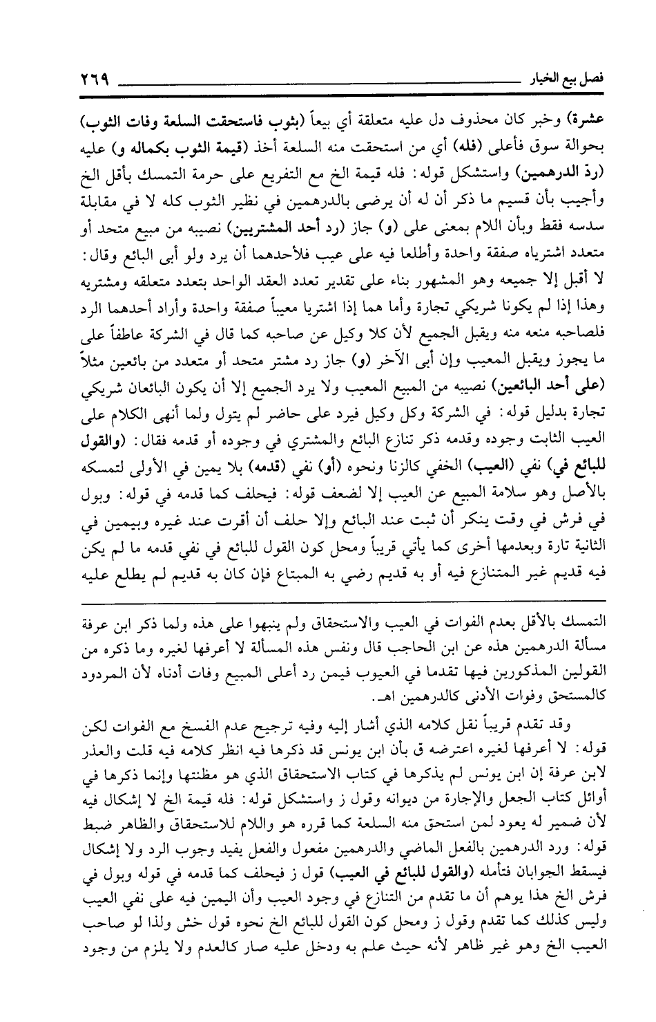وقد تقدم قريبًا نقل كلامه الذي أشار إليه وفيه ترجيح عدم الفسخ مع الفوات لكن قوله: لا أعرفها لغيره اعترضه ق بأن ابن يونس قد ذكرها فيه انظر كلامه فيه قلت والعذر لابن عرفة إن ابن يونس لم يذكرها في كتاب الاستحقاق الذي هو مظنتها وإنما ذكرها في أوائل كتاب الجعل والإجارة من ديوانه وقول ز واستشكل قوله: فله قيمة الخ لا إشكال فيه لأن ضمير له يعود لمن استحق منه السلعة كما قرره هو واللام للاستحقاق والظاهر ضبط قوله: ورد الدرهمين بالفعل الماضي والدرهمين مفعول والفعل يفيد وجوب الرد ولا إشكال فيسقط الجوابان فتأمله (والقول للبائع في العيب) قول ز فيحلف كما قدمه في قوله وبول في فرش الخ هذا يوهم أن ما تقدم من التنازع في وجود العيب وأن اليمين فيه على نفي العيب وليس كذلك كما تقدم وقول ز ومحل كون القول للبائع الخ نحوه قول خش ولذا لو صاحب العيب الخ وهو غير ظاهر لأنه حيث علم به ودخل عليه صار كالعدم ولا يلزم من وجود