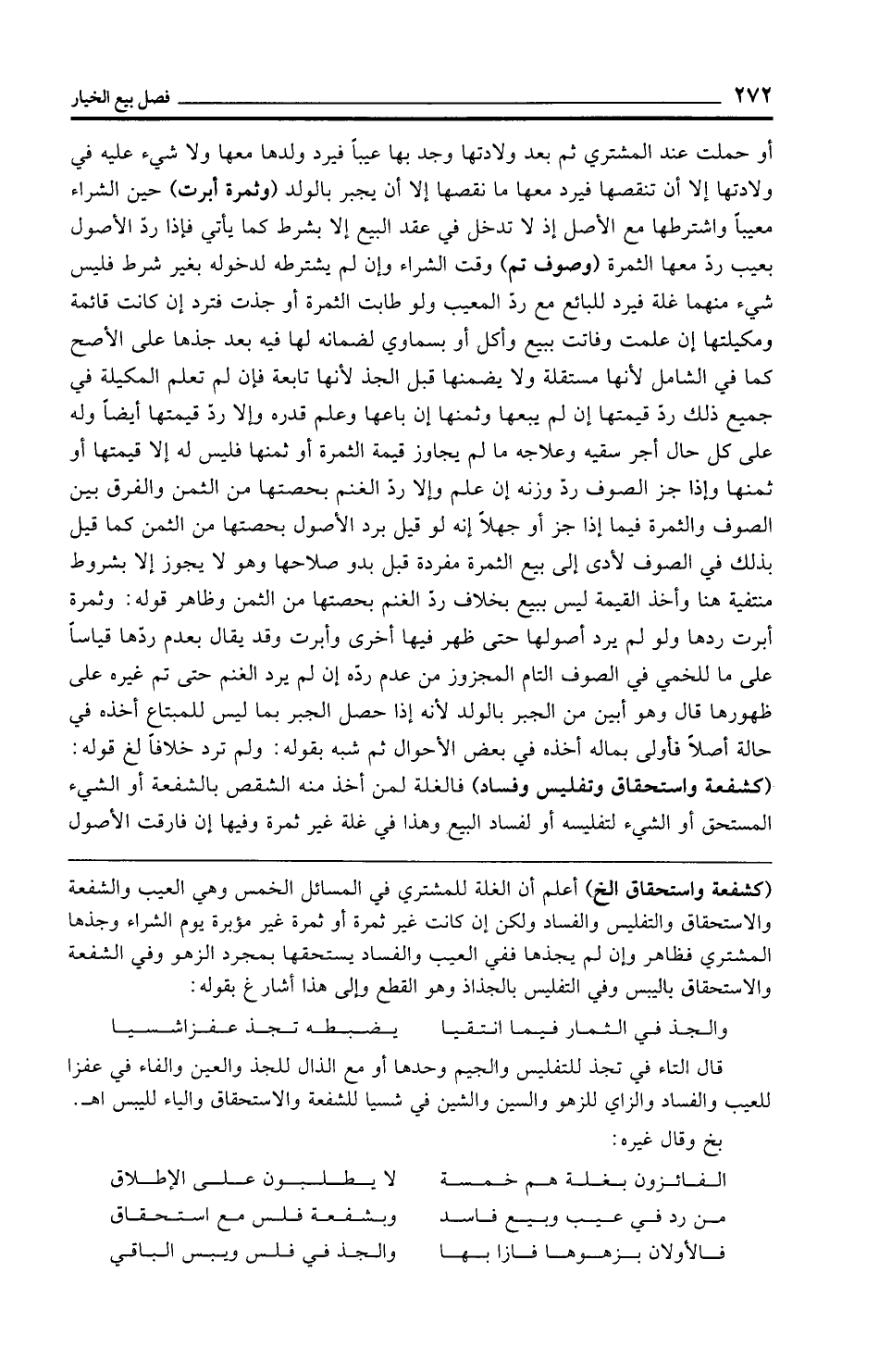 أو حملت عند المشتري ثم بعد ولادتها وجد بها عيبًا فيرد ولدها معها ولا شيء عليه في ولادتها إلا أن تنقصها فيرد معها ما نقصها إلا أن يجبر بالولد (وثمرة أبرت) حين الشراء معيبًا واشترطها مع الأصل إذ لا تدخل في عقد البيع إلا بشرط كما يأتي فإذا ردّ الأصول بعيب ردّ معها الثمرة (وصوف تم) وقت الشراء وإن لم يشترطه لدخوله بغير شرط فليس شيء منهما غلة فيرد للبائع مع ردّ المعيب ولو طابت الثمرة أو جذت فترد إن كانت قائمة ومكيلتها إن علمت وفاتت ببيع وأكل أو بسماوي لضمانه لها فيه بعد جذها على الأصح كما في الشامل لأنها مستقلة ولا يضمنها قبل الجذ لأنها متابعة فإن لم تعلم المكيلة في جميع ذلك ردّ قيمتها إن لم يبعها وثمنها إن باعها وعلم قدره وإلا ردّ قيمتها أيضًا وله على كل حال أجر سقيه وعلاجه ما لم يجاوز قيمة الثمرة أو ثمنها فليس له إلا قيمتها أو ثمنها وإذا جز الصوف ردّ وزنه إن علم وإلا ردّ الغنم بحصتها من الثمن والفرق بين الصوف والثمرة فيما إذا جز أو جهلًا إنه لو قيل برد الأصول بحصتها من الثمن كما قيل بذلك في الصوف لأدى إلى بيع الثمرة مفردة قبل بدو صلاحها وهو لا يجوز إلا بشروط منتفية هنا وأخذ القيمة ليس ببيع بخلاف ردّ الغنم بحصتها من الثمن وظاهر قوله: وثمرة أبرت ردها ولو لم يرد أصولها حتى ظهر فيها أخرى وأبرت وقد يقال بعدم ردّها قياسًا على ما للخمي في الصوف التام المجزوز من عدم ردّه إن لم يرد الغنم حتى تم غيره على ظهورها قال وهو أبين من الجبر بالولد لأنه إذا حصل الجبر بما ليس للمبتاع أخذه في حالة أصلًا فأولى بماله أخذه في بعض الأحوال ثم شبه بقوله: ولم ترد خلافًا لغ قوله: (كشعفة واستحاق وتفليس وفساد) فالغلة لمن أخذ منه الشقص بالشفعة أو الشيء المستحق أو الشيء لتفليسه أو لفساد البيع وهذا في غلة غير ثمرة وفيها إن فارقت الأصول