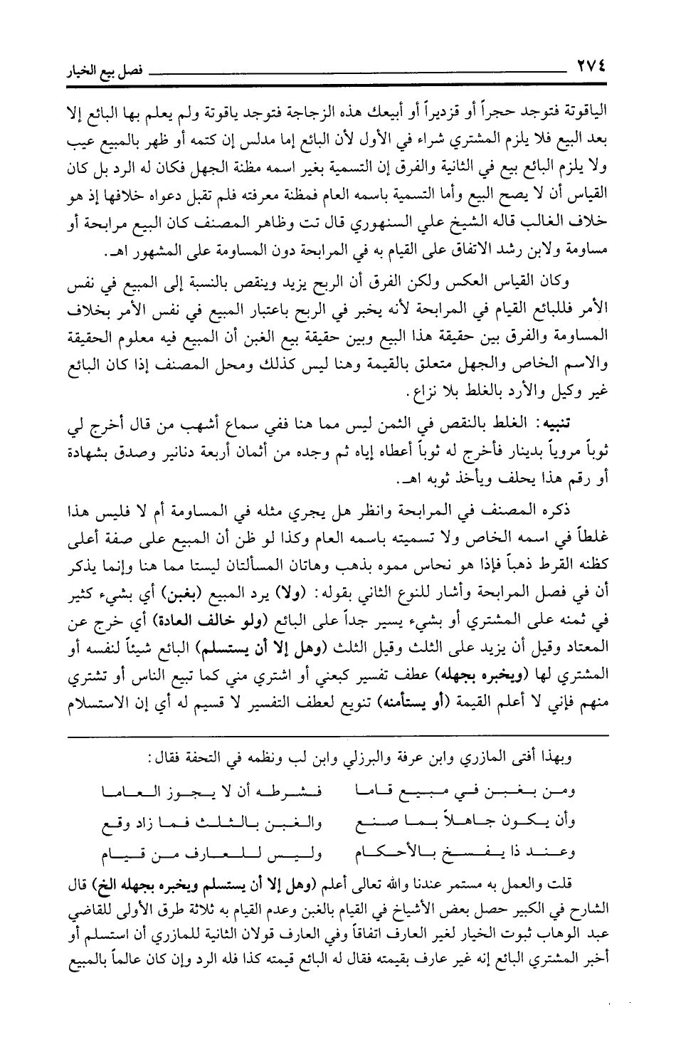 الياقوتة فتوجد حجرًا أو قزديرًا أو أبيعك هذه الزجاجة فتوجد ياقوتة ولم يعلم بها البائع إلا بعد البيع فلا يلزم المشتري شراء في الأول لأن البائع إما مدلس إن كتمه أو ظهر بالمبيع عيب ولا يلزم البائع بيع في الثانية والفرق إن التسمية بغير اسمه مظنة الجهل فكان له الرد بل كان القياس أن لا يصح البيع وأما التسمية باسمه العام فمظنة معرفته فلم تقبل دعواه خلافها إذ هو خلاف الغالب قاله الشيخ علي السنهوري قال تت وظاهر المصنف كان البيع مرابحة أو مساومة ولابن رشد الاتفاق على القيام به في المرابحة دون المساومة على المشهور اهـ.