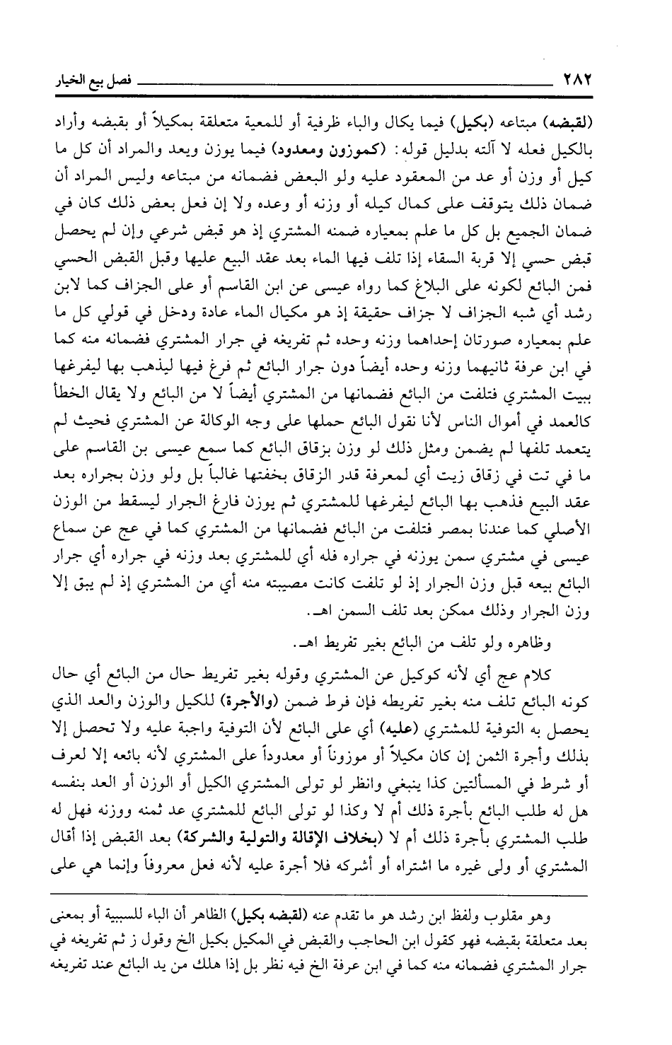 وهو مقلوب ولفظ ابن رشد هو ما تقدم عنه (لقبضه بكيل) الظاهر أن الباء للسببية أو بمعنى بعد متعلقة بقبضه فهو كقول ابن الحاجب والقبض في المكيل بكيل الخ وقول ز ثم تفريغه في جرار المشتري فضمانه منه كما في ابن عرفة الخ فيه نظر بل إذا هلك من يد البائع عند تفريغه