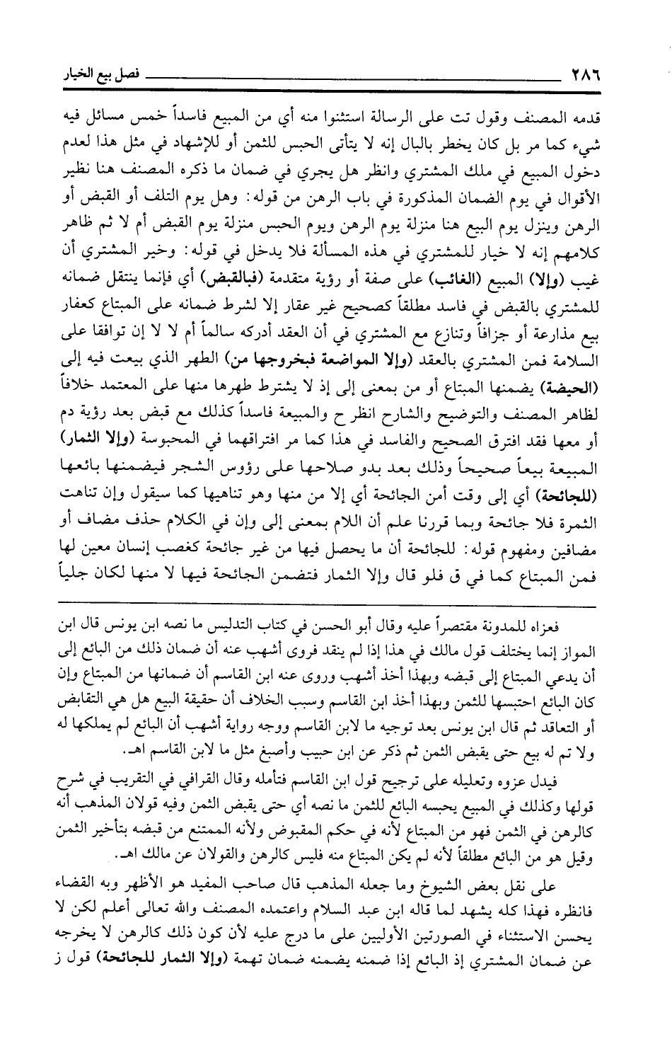 قدمه المصنف وقول تت على الرسالة استثنوا منه أي من المبيع فاسدًا خمس مسائل فيه شيء كما مر بل كان يخطر بالبال إنه لا يتأتى الحبس للثمن أو للإشهاد في مثل هذا لعدم دخول المبيع في ملك المشتري وانظر هل يجري في ضمان ما ذكره المصنف هنا نظير الأقول في يوم الضمان المذكور في باب الرهن من قوله: وهل يوم التلف أو القبض أو الرهن وينزل يوم البيع هنا منزلة يوم الرهن ويوم الحبس منزلة يوم القبض أم لا ثم ظاهر كلامهم إنه لا خيار للمشتري في هذه المسألة فلا يدخل في قوله: وخير المشتري أن غيب (وإلا) المبيع (الغائب) على صفة أو رؤية متقدمة (فبالقبض) أي فإنما ينتقل ضمانه للمشتري بالقبض في فاسد مطلقًا كصحيح غير عقار إلا لشرط ضمانه على المبتاع كعفار بيع مذارعة أو جزافًا وتنازع مع المشتري في أن العقد أدركه سالمًا أم لا لا إن توافقا على السلامة فمن المشتري بالعقد (وإلا المواضعة فبخروجها من) الطهر الذي بيعت فيه إلى (الحيضة) يضمنها المبتاع أو من بمعنى إلى إذ لا يشترط طهرها منها على المعتمد خلافًا لظاهر المصنف والتوضيح والشارح انظر ح والمبيعة فاسدًا كذلك مع قبض بعد رؤية دم أو معها فقد افترق الصحيح والفاسد في هذا كما مر افتراقهما في المحبوسة (وإلا الثمار) المبيعة بيعًا صحيحًا وذلك بعد بدو صلاحها على رؤوس الشجر فيضمنها بائعها (للجائحة) أي إلى وقت أمن الجائحة أي إلا من منها وهو تناهيها كما سيقول وإن تناهت الثمرة فلا جائحة وبما قررنا علم أن اللام بمعنى إلى وإن في الكلام حذف مضاف أو مضافين ومفهوم قوله: للجائحة أن ما يحصل فيها من غير جائحة كغصب إنسان معين لها فمن المبتاع كما في ق فلو قال وإلا الثمار فتضمن الجائحة فيها لا منها لكان جليًّا