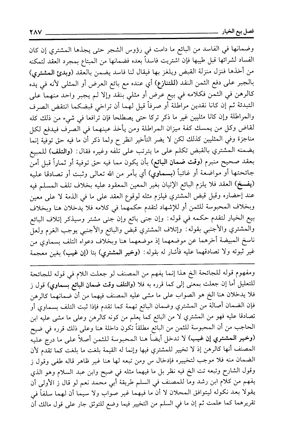ومفهوم قوله للجائحة الخ هذا إنما يفهم من المصنف لو جعلت اللام في قوله للجائحة للتعليل أما إن جعلت بمعنى إلى كما قرره به فلا (والتلف وقت ضمان البائع بسماوي) قول ز فلا يدخلان هنا الخ هو الصواب على ما مشى عليه المصنف فيهما من أن ضمانهما كالرهن فإن الضمان أصالة من المشتري وضمان البائع تهمة كما تقدم فإذا ثبت التلف بسماوي أو تصادقا عليه فهو من المشتري لا من البائع كما يعلم من كونه كالرهن وعلى ما مشى عليه ابن الحاجب من أن المحبوسة للثمن من البائع مطلقًا تكون داخلة هنا وعلى ذلك قرره في ضيح (وخير المشتري إن غيب) لا تدخل أيضًا هنا المحبوسة للثمن أصلًا على ما درج عليه المصنف أنها كالرهن إذ لا تخيير للمشتري فيها وإنما له القيمة بلغت ما بلغت كما تقدم لأن الضمان منه فلا موجب لتخييره فإدخال س ومن تبعه لها هنا غير ظاهر قاله طفى وقول ز وقول الشارح وتبعه تت الخ فيه نظر ما فيهما مثله في ضيح وابن عبد السلام وهو الذي يفهم من كلام ابن رشد وما للمصنف في السلم طريقة أبي محمد نعم لو قال ز الأولى أن يقولا بعد نكوله ليتوافق المحلان لا أن ما فيهما غير صواب ولا سيما أن لهما سلفًا في تقريرهما كما علمت ثم إن ما في السلم من التخيير فيما وضع للتوثق جار على قول مالك أن
