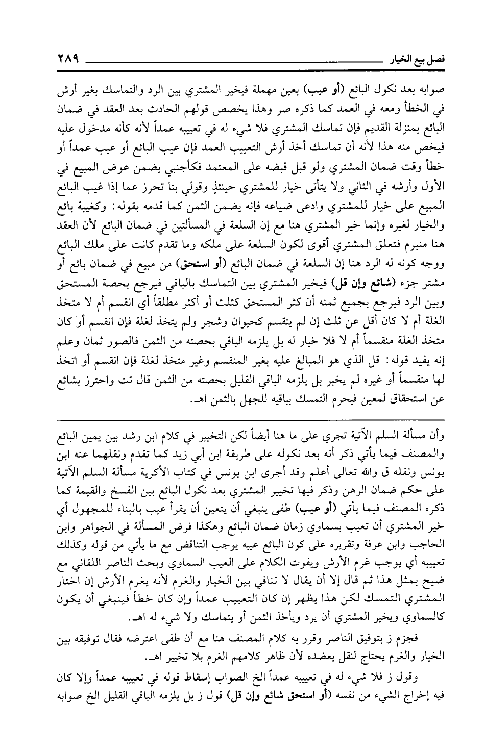 وأن مسألة السلم الآتية تجري على ما هنا أيضًا لكن التخيير في كلام ابن رشد بين يمين البائع والمصنف فيما يأتي ذكر أنه بعد نكوله على طريقة ابن أبي زيد كما تقدم ونقلهما عنه ابن يونس ونقله ق والله تعالى أعلم وقد أجرى ابن يونس في كتاب الأكرية مسألة السلم الآتية على حكم ضمان الرهن وذكر فيها تخيير المشتري بعد نكول البائع بين الفسخ والقيمة كما ذكره المصنف فيما يأتي (أو عيب) طفى ينبغي أن يتعين أن يقرأ عيب بالبناء للمجهول أي خير المشتري أن تعيب بسماوي زمان ضمان البائع وهكذا فرض المسألة في الجواهر وابن الحاجب وابن عرفة وتقريره على كون البائع عيبه يوجب التناقض مع ما يأتي من قوله وكذلك تعييبه أي يوجب غرم الأرش ويفوت الكلام على العيب السماوي وبحث الناصر اللقاني مع ضيح بمثل هذا ثم قال إلا أن يقال لا تنافي بين الخيار والغرم لأنه يغرم الأرش إن اختار المشتري التمسك لكن هذا يظهر إن كان التعييب عمدًا وإن كان خطأً فينبغي أن يكون كالسماوي ويخير المشتري أن يرد ويأخذ الثمن أو يتماسك ولا شيء له اهـ.