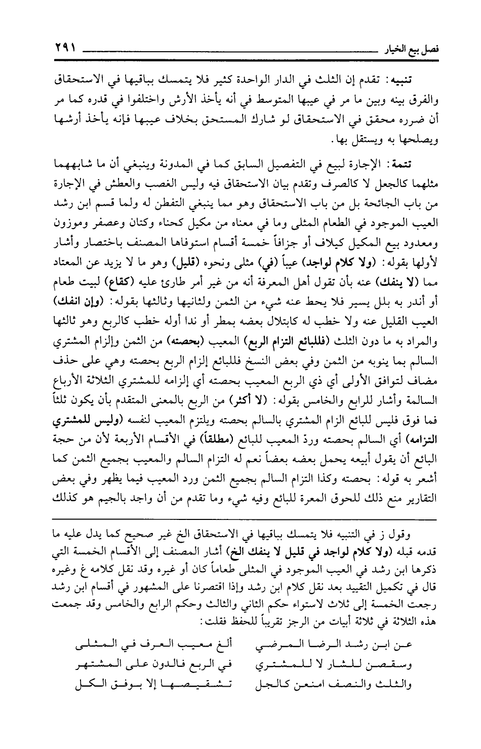 وقول ز في التنبيه فلا يتمسك بباقيها في الاستحقاق الخ غير صحيح كما يدل عليه ما قدمه قبله (ولا كلام لواجد في قليل لا ينفك الخ) أشار المصنف إلى الأقسام الخمسة التي ذكرها ابن رشد في العيب الموجود في المثلى طعامًا كان أو غيره وقد نقل كلامه غ وغيره قال في تكميل التقييد بعد نقل كلام ابن رشد وإذا اقتصرنا على المشهور في أقسام ابن رشد رجعت الخمسة إلى ثلاث لاستواء حكم الثاني والثالث وحكم الرابع والخامس وقد جمعت هذه الثلاثة في ثلاثة أبيات من الرجز تقريبًا للحفظ فقلت: