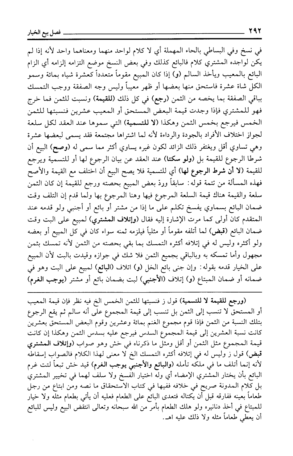 في نسخ وفي البساطي بالحاء المهملة أي لا كلام لواحد منهما ومعناهما واحد لأنه إذا لم يكن لواجده المشتري كلام فالبائع كذلك وفي بعض النسخ موضع التزامه إلزامه أي الزام البائع بالمعيب ويأخذ السالم (و) إذا كان المبيع مقومًا متعددًا كعشرة شياه بمائة وسمو الكل شاة عشرة فاستحق منها بعضها أو ظهر معيبًا وليس وجه الصفقة ووجب التمسك بباقي الصفقة بما يخصه من الثمن (رجع) في كل ذلك (للقيمة) ونسبت للثمن فما خرج فهو للمشتري فإذا وجدت قيمة البعض المستحق أو المعيب عشرين فنسبتها للثمن الخمس فيرجع بخمس الثمن وهكذا (لا للتسمية) التي سموها عند العقد لكل سلعة لجواز اختلاف الأفراد بالجودة والرداءة لأنه لما اشتراها مجتمعة فقد يسمى لبعضها عشرة وهي تساوي أقل ويغتفر ذلك الزائد لكون غيره يساوي أكثر مما سمى له (وصح) البيع أن شرطا الرجوع للقيمة بل (ولو سكتا) عند العقد عن بيان الرجوع لها أو للتسمية ويرجع للقيمة (لا أن شرط الرجوع لها) أي للتسمية فلا يصح البيع أن اختلف مع القيمة والأصح فهذه المسألة من تتمة قوله: سابقًا وردّ بعض المبيع بحصته ورجع للقيمة إن كان الثمن سلعة والقيمة هناك قيمة السلعة المرجوع فيها وهنا المرجوع بها ولما قدم إن التلف وقت ضمان البائع بسماوي يفسخ تكلم على ما إذا من مشتر أو بائع أو أجنبي ولو قدمه عند المتقدم كان أولى كما مرت الإشارة إليه فقال (وإتلاف المشتري) لمبيع على البت وقت ضمان البائع (قبض) لما أتلفه مقومًا أو مثليًّا فيلزمه ثمنه سواء كان في كل المبيع أو بعضه ولو أكثره وليس له في إتلافه أكثره التمسك بما بقي بحصته من الثمن لأنه تمسك بثمن مجهول وأما تمسكه به وبالباقي بجميع الثمن فلا شك في جوازه وقيدت بالبت لأن المبيع على الخيار قدمه بقوله: وإن جنى بائع الخل (و) إتلاف (البائع) لمبيع على البت وهو في ضمانه أو ضمان المبتاع (و) إتلاف (الأجنبي) ليست بضمان بائع أو مشتر (يوجب الغرم)