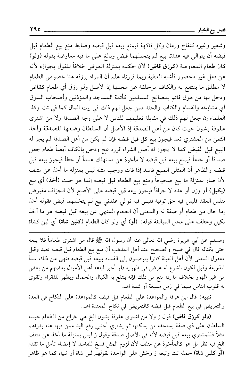 (ولو كرزق قاض) قول ز ولا من اشترى علوفة بشون الخ هي خراج من الطعام حبسه السلطان على ذي صفة يستحقه من يسكنها ثم يشتري أجنبي رفع اليد ممن فيها عنه بدراهم مثلًا فللمشتري بيعه قبل قبضه لأنه في الأصل صدقة وقول ز ليس بمنزلة ما أخذ عن متلف الخ فيه نظر بل هو كالمأخوذ عن متلف لأن لزوم المثل فسخ للفاسد لا إمضاء تأمل ما تقدم (أو كلبن شاة) حمله تت وتبعه ز وخش على الواحدة لقولهم لبن شاة أو شياه كما هو ظاهر