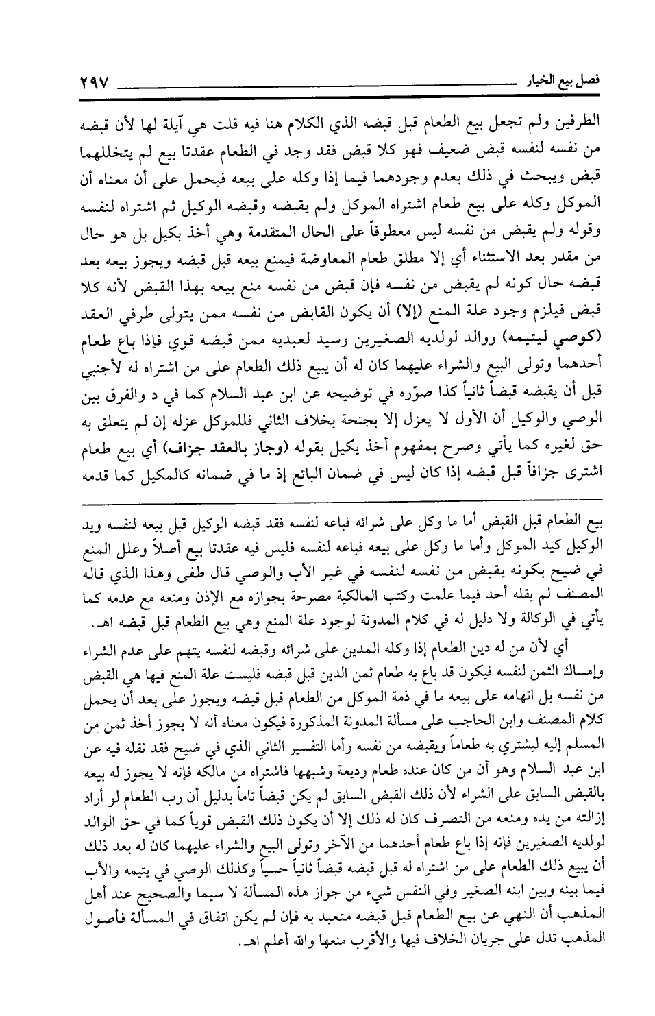 بيع الطعام قبل القبض أما ما وكل على شرائه فباعه لنفسه فقد قبضه الوكيل قبل بيعه لنفسه ويد الوكيل كيد الموكل وأما ما وكل على بيعه فباعه لنفسه فليس فيه عقدتا بيع أصلًا وعلل المنع في ضيح بكونه يقبض من نفسه لنفسه في غير الأب والوصي قال طفى وهذا الذي قاله المصنف لم يقله أحد فيما علمت وكتب المالكية مصرحة بجوازه مع الإذن ومنعه مع عدمه كما يأتي في الوكالة ولا دليل له في كلام المدونة لوجود علة المنع وهي بيع الطعام قبل قبضه اهـ.