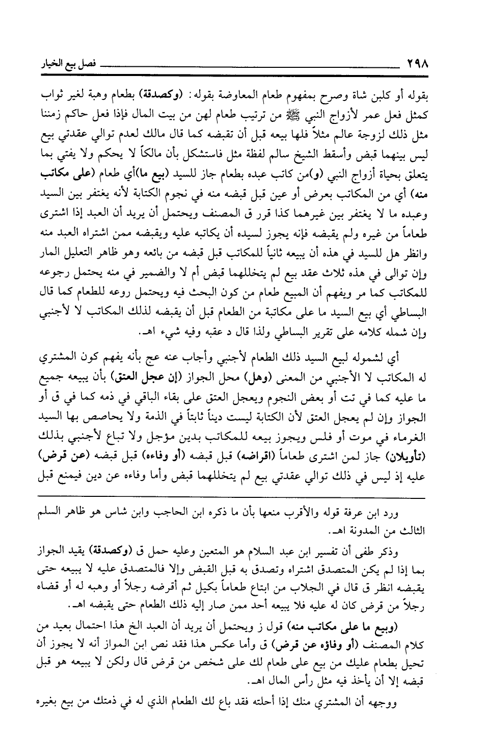 أي لشموله لبيع السيد ذلك الطعام لأجنبي وأجاب عنه عج بأنه يفهم كون المشتري له المكاتب لا الأجنبي من المعنى (وهل) محل الجواز (إن عجل العتق) بأن يبيعه جميع ما عليه كما في تت أو بعض النجوم ويعجل العتق على بقاء الباقي في ذمه كما في ق أو الجواز وإن لم يعجل العتق لأن الكتابة ليست دينًا ثابتًا في الذمة ولا يحاصص بها السيد الغرماء في موت أو فلس ويجوز بيعه للمكاتب بدين مؤجل ولا تباع لأجنبي بذلك (تأويلان) جاز لمن اشترى طعامًا (إقراضه) قبل قبضه (أو وفاءه) قبل قبضه (عن قرض) عليه إذ ليس في ذلك توالي عقدتي بيع لم يتخللهما قبض وأما وفاءه عن دين فيمنع قبل