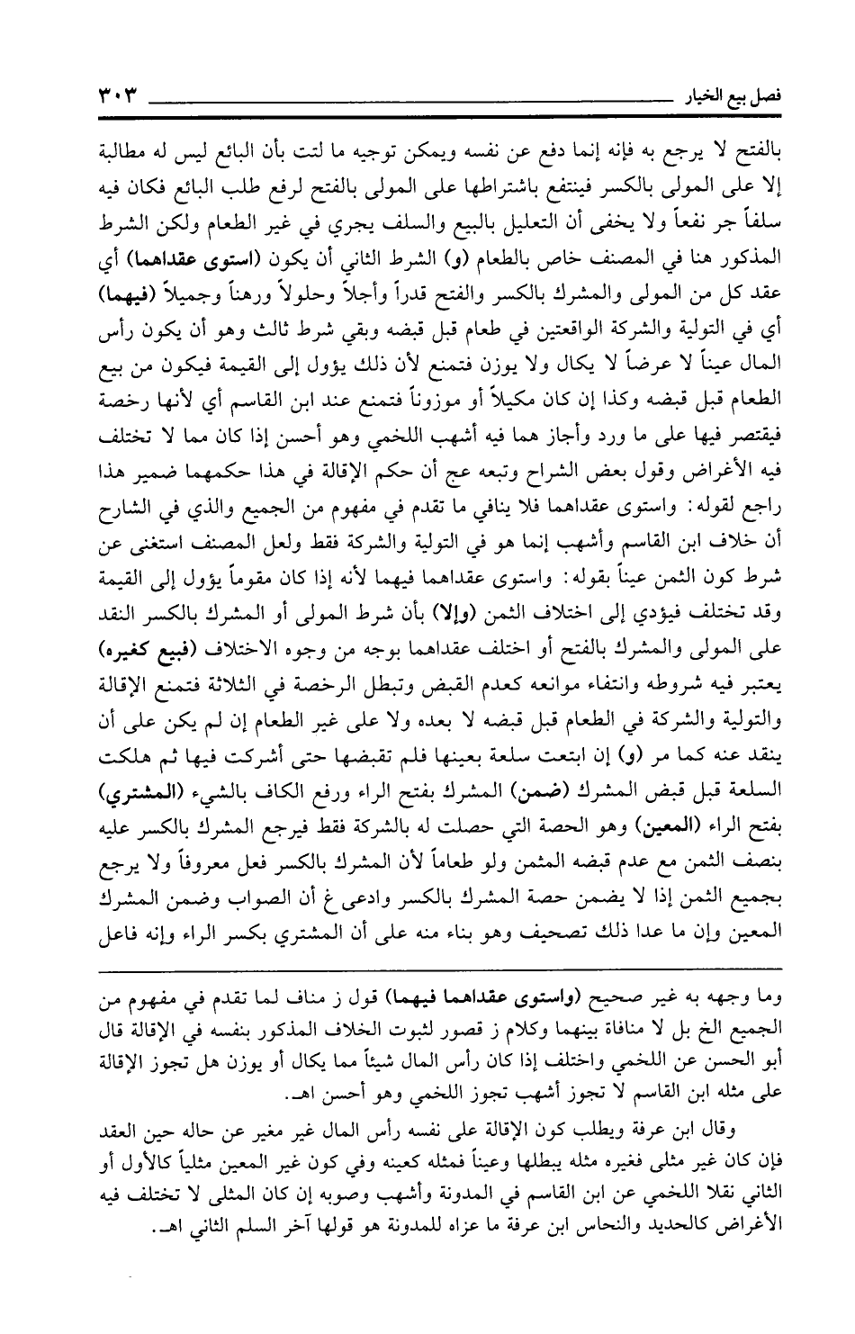 بالفتح لا يرجع به فإنه إنما دفع عن نفسه ويمكن توجيه ما لتت بأن البائع ليس له مطالبة إلا على المولى بالكسر فينتفع باشتراطها على المولى بالفتح لرفع طلب البائع فكان فيه سلفًا جر نفعًا ولا يخفى أن التعليل بالبيع والسلف يجري في غير الطعام ولكن الشرط المذكور هنا في المصنف خاص بالطعام (و) الشرط الثاني أن يكون (استوى عقداهما) أي عقد كل من المولى والمشرك بالكسر والفتح قدرًا وأجلًا وحلولًا ورهنًا وجميلًا (فيهما) أي في التولية والشركة الواقعتين في طعام قبل قبضه وبقي شرط ثالث وهو أن يكون رأس المال عينًا لا عرضًا لا يكال ولا يوزن فتمنع لأن ذلك يؤول إلى القيمة فيكون من بيع الطعام قبل قبضه وكذا إن كان مكيلًا أو موزونًا فتمنع عند ابن القاسم أي لأنها رخصة فيقتصر فيها على ما ورد وأجاز هما فيه أشهب اللخمي وهو أحسن إذا كان مما لا تختلف فيه الأغراض وقول بعض الشراح وتبعه عج أن حكم الإقالة في هذا حكمهما ضمير هذا راجع لقوله: واستوى عقداهما فلا ينافي ما تقدم في مفهوم من الجميع والذي في الشارح أن خلاف ابن القاسم وأشهب إنما هو في التولية والشركة فقط ولعل المصنف استغنى عن شرط كون الثمن عينًا بقوله: واستوى عقداهما فيهما لأنه إذا كان مقومًا يؤول إلى القيمة وقد تختلف فيؤدي إلى اختلاف الثمن (وإلا) بأن شرط المولى أو المشرك بالكسر النقد على المولى والمشرك بالفتح أو اختلف عقداهما بوجه من وجوه الاختلاف (فبيع كغيره) يعتبر فيه شروطه وانتفاء موانعه كعدم القبض وتبطل الرخصة في الثلاثة فتمنع الإقالة والتولية والشركة في الطعام قبل قبضه لا بعده ولا على غير الطعام إن لم يكن على أن ينقد عنه كما مر (و) إن ابتعت سلعة بعينها فلم تقبضها حتى أشركت فيها ثم هلكت السلعة قبل قبض المشرك (ضمن) المشرك بفتح الراء ورفع الكاف بالشيء (المشتري) بفتح الراء (المعين) وهو الحصة التي حصلت له بالشركة فقط فيرجع المشرك بالكسر عليه بنصف الثمن مع عدم قبضه المثمن ولو طعامًا لأن المشرك بالكسر فعل معروفًا ولا يرجع بجميع الثمن إذا لا يضمن حصة المشرك بالكسر وادعى غ أن الصواب وضمن المشرك المعين وإن ما عدا ذلك تصحيف وهو بناء منه على أن المشتري بكسر الراء وإنه فاعل