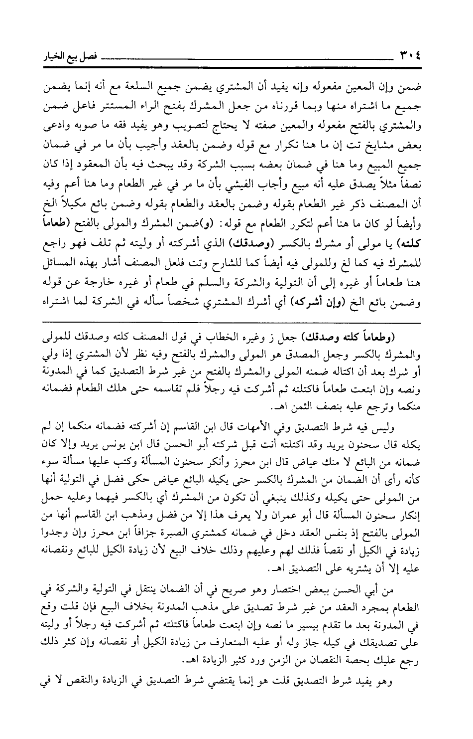 من أبي الحسن ببعض اختصار وهو صريح في أن الضمان ينتقل في التولية والشركة في الطعام بمجرد العقد من غير شرط تصديق على مذهب المدونة بخلاف البيع فإن قلت وقع في المدونة بعد ما تقدم بيسير ما نصه وإن ابتعت طعامًا فاكتلته ثم أشركت فيه رجلًا أو وليته على تصديقك في كيله جاز وله أو عليه المتعارف من زيادة الكيل أو نقصانه وإن كثر ذلك رجع عليك بحصة النقصان من الزمن ورد كثير الزيادة اهـ.