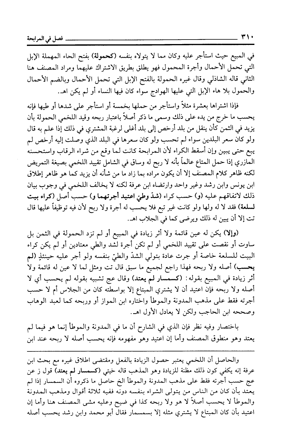 فإذا اشتراها بعشرة مثلًا واستأجر من حملها بخمسة أو استأجر على شدها أو طيها فإنه يحسب ما خرج من يده على ذلك وسمى ما ذكر أصلًا باعتبار ربحه وقيد اللخمي الحمولة بأن يزيد في الثمن كأن ينقل من بلد أرخص إلى بلد أغلى لرغبة المشتري في ذلك إذا علم به قال ولو كان سعر البلدين سواء لم تحسب ولو كان سعرها في البلد الذي وصلت إليه أرخص لم يبع حتى يبين وإن أسقط الكراء لأن المرابحة كانت لما وقع من شراء الرقاب واستحسنه المازري إذا حمل المتاع عالمًا بأنه لا ربح له وساق في الشامل تقييد اللخمي بصيغة التمريض لكنه ظاهر كلام المصنف إلا أن يكون مراده بما زاد ما من شأنه أن يزيد كما هو ظاهر إطلاق ابن يونس وابن رشد وغير واحد وارتضاه ابن عرفة لكنه لا يخالف اللخمي في وجوب بيان ذلك لاتفاقهم عليه (و) حسب كراء (شدّ وطيّ اعتيد أجرتهما و) حسب أصل (كراء بيت لسلعة) فقد لا له ولها ولو كانت غير تبع فلا يحسب له أجرة ولا ربح لأن فيه توظيفًا عليها قال تت إلا أن يبين له ذلك ويرضى كما في الجلاب اهـ.