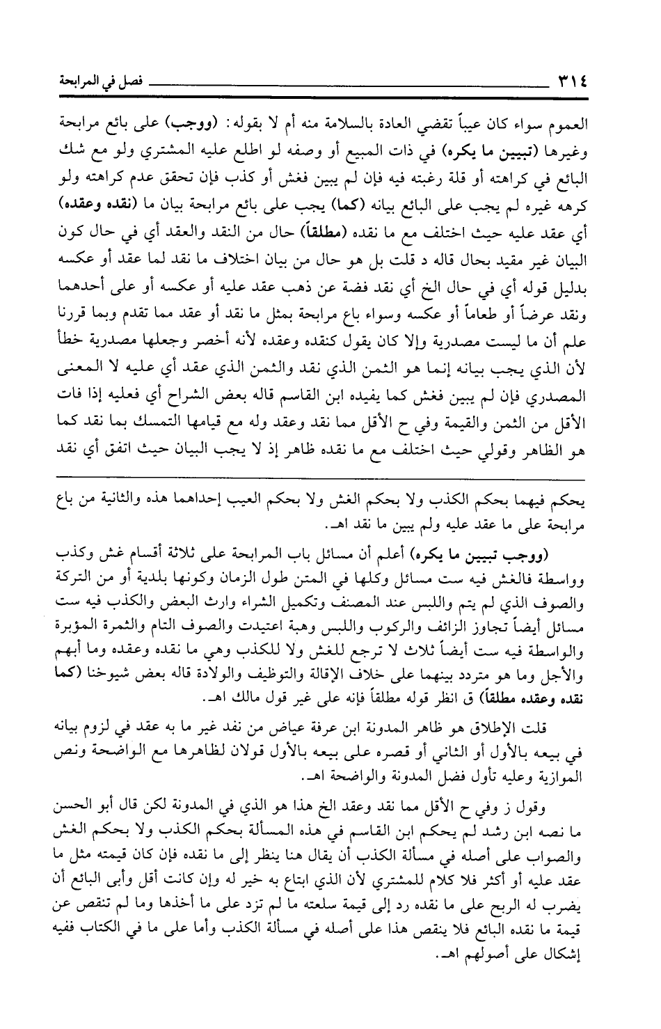 (ووجب تبيين ما يكره) أعلم أن مسائل باب المرابحة على ثلاثة أقسام غش وكذب وواسطة فالغش فيه ست مسائل وكلها في المتن طول الزمان وكونها بلدية أو من التركة والصوف الذي لم يتم واللبس عند المصنف وتكميل الشراء وارث البعض والكذب فيه ست مسائل أيضًا تجاوز الزائف والركوب واللبس وهبة اعتيدت والصوف التام والثمرة المؤبرة والواسطة فيه ست أيضًا ثلاث لا ترجع للغش ولا للكذب وهي ما نقده وعقده وما أبهم والأحل وما هو متردد بينهما على خلاف الإقالة والتوظيف والولادة قاله بعض شيوخنا (كما نقده وعقده مطلقًا) ق انظر قوله مطلقًا فإنه على غير قول مالك اهـ.