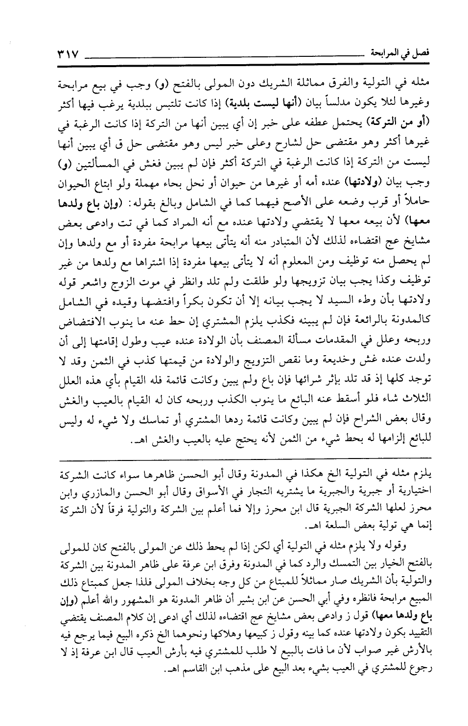 وقوله ولا يلزم مثله في التولية أي لكن إذا لم يحط ذلك عن المولى بالفتح كان للمولى بالفتح الخيار بين التمسك والرد كما في المدونة وفرق ابن عرفة على ظاهر المدونة بين الشركة والتولية بأن الشريك صار مماثلًا للمبتاع من كل وجه بخلاف المولى فلذا جعل كمبتاع ذلك المبيع مرابحة فانظره وفي أبي الحسن عن ابن بشير أن ظاهر المدونة هو المشهور والله أعلم (وإن باع ولدها معها) قول ز وادعى بعض مشايخ عج اقتضاءه لذلك أي ادعى إن كلام المصنف يقتضي التقييد يكون ولادتها عنده كما بينه وقول ز كبيعها وهلاكها ونحوهما الخ ذكره البيع فيما يرجع فيه بالأرش غير صواب لأن ما فات بالبيع لا طلب للمشتري فيه بأرش العيب قال ابن عرفة إذ لا رجوع للمشتري في العيب بشيء بعد البيع على مذهب ابن القاسم اهـ.