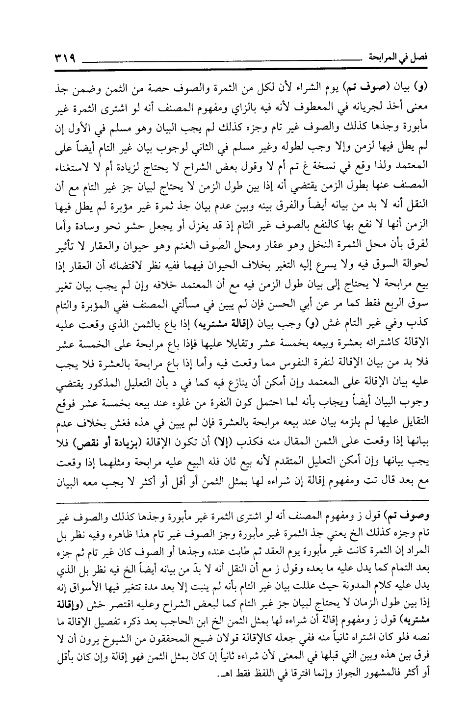 (و) بيان (صوف تم) يوم الشراء لأن لكل من الثمرة والصوف حصة من الثمن وضمن جذ معنى أخذ لجريانه في المعطوف لأنه فيه بالزاي ومفهوم المصنف أنه لو اشترى الثمرة غير مأبورة وجدها كذلك والصوف غير تام وجزه كذلك لم يجب البيان وهو مسلم في الأول إن لم يطل فيها لزمن وإلا وجب لطوله وغير مسلم في الثاني لوجوب بيان غير التام أيضًا على المعتمد ولذا وقع في نسخة غ تم أم لا وقول بعض الشراح لا يحتاج لزيادة أم لا لاستغناء المصنف عنها بطول الزمن يقتضي أنه إذا بين طول الزمن لا يحتاج لبيان جز غير التام مع أن النقل أنه لا بد من بيانه أيضًا والفرق بينه وبين عدم بيان جذ ثمرة غير مؤبرة لم يطل فيها الزمن أنها لا نفع بها كالنفع بالصوف غير التام إذ قد يغزل أو يجعل حشو نحو وسادة وأما لفرق بأن محل الثمرة النخل وهو عقار ومحل الصوف الغنم وهو حيوان والعقار لا تأثير لحوالة السوق فيه ولا يسرع إليه التغير بخلاف الحيوان فيهما ففيه نظر لاقتضائه أن العقار إذا بيع مرابحة لا يحتاج إلى بيان طول الزمن فيه مع أن المعتمد خلافه وإن لم يجب بيان تغير سوق الربع فقط كما مر عن أبي الحسن فإن لم يبين في مسألتي المصنف ففي المؤبرة والتام كذب وفي غير التام غش (و) وجب بيان (إقالة مشتريه) إذا باع بالثمن الذي وقعت عليه الإقالة كاشترائه بعشرة وبيعه بخمسة عشر وتقايلا عليها فإذا باع مرابحة على الخمسة عشر فلا بد من بيان الإقالة لنفرة النفوس مما وقعت فيه وأما إذا باع مرابحة بالعشرة فلا يجب عليه بيان الإقالة على المعتمد وإن أمكن أن ينازع فيه كما في د بأن التعليل المذكور يقتضي وجوب البيان أيضًا ويجاب بأنه لما احتمل كون النفرة من غلوه عند بيعه بخمسة عشر فوقع التقايل عليها لم يلزمه بيان عند بيعه مرابحة بالعشرة فإن لم يبين في هذه فغش بخلاف عدم بيانها إذا وقعت على الثمن المقال منه فكذب (إلا) أن تكون الإقالة (بزيادة أو نقص) فلا يجب بيانها وإن أمكن التعليل المتقدم لأنه بيع ثان فله البيع عليه مرابحة ومثلهما إذا وقعت مع بعد قال تت ومفهوم إقالة إن شراءه لها بمثل الثمن أو أقل أو أكثر لا يجب معه البيان