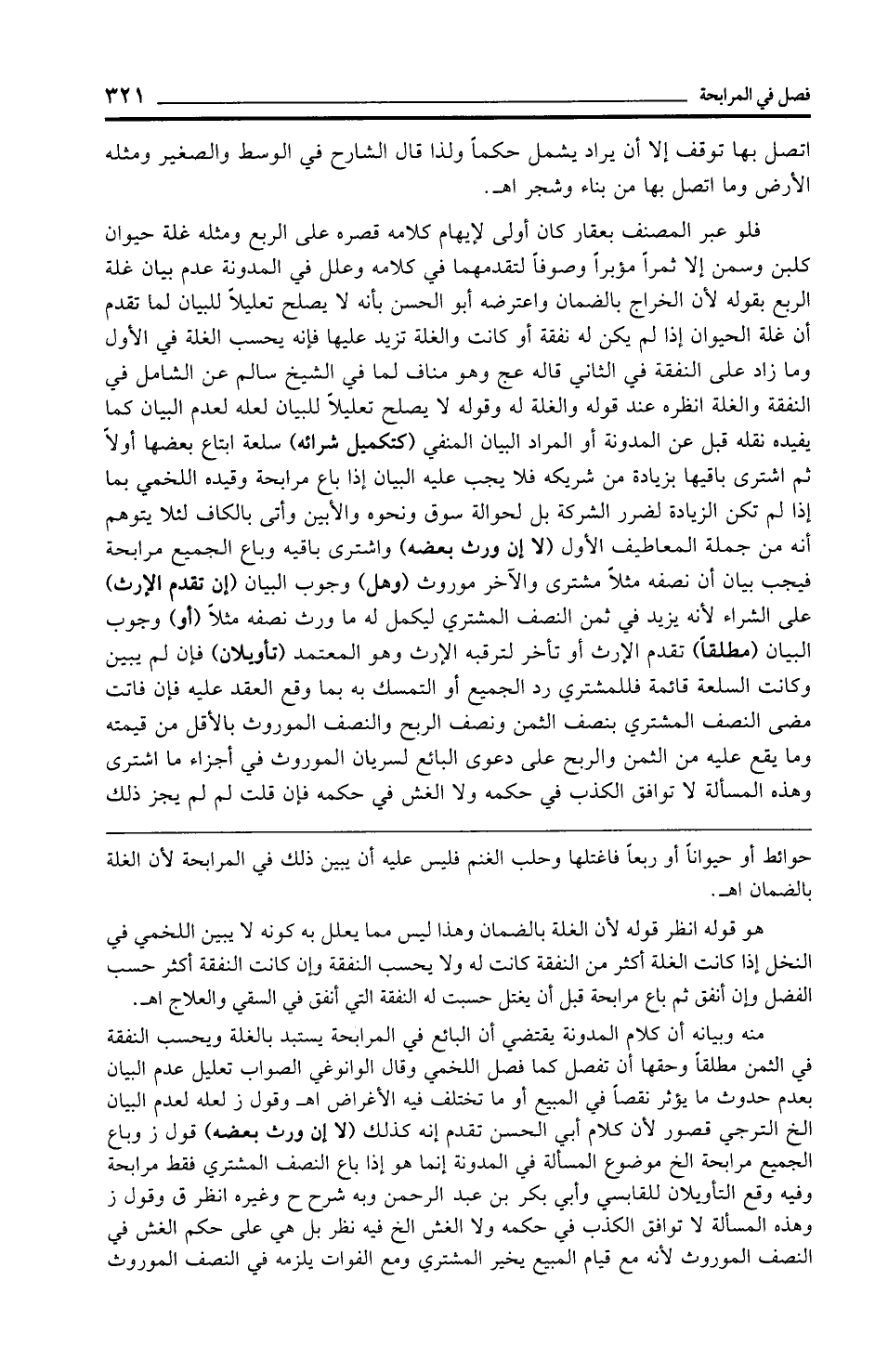 منه وبيانه أن كلام المدونة يقتضي أن البائع في المرابحة يستبد بالغلة ويحسب النفقة في الثمن مطلقًا وحقها أن تفصل كما فصل اللخمي وقال الوانوغي الصواب تعليل عدم البيان بعدم حدوث ما يؤثر نقصًا في المبيع أو ما تختلف فيه الأغراض اهـ وقول ز لعله لعدم البيان الخ الترجي قصور لأن كلام أبي الحسن تقدم إنه كذلك (لا إن ورث بعضه) قول ز وباع الجميع مرابحة الخ موضوع المسألة في المدونة إنما هو إذا باع النصف المشتري فقط مرابحة وفيه وقع التأويلان للقابسي وأبي بكر بن عبد الرحمن وبه شرح ح وغيره انظر ق وقول ز وهذه المسألة لا توافق الكذب في حكمه ولا الغش الخ فيه نظر بل هي على حكم الغش في النصف الموروث لأنه مع قيام المبيع يخير المشتري ومع الفوات يلزمه في النصف الموروث