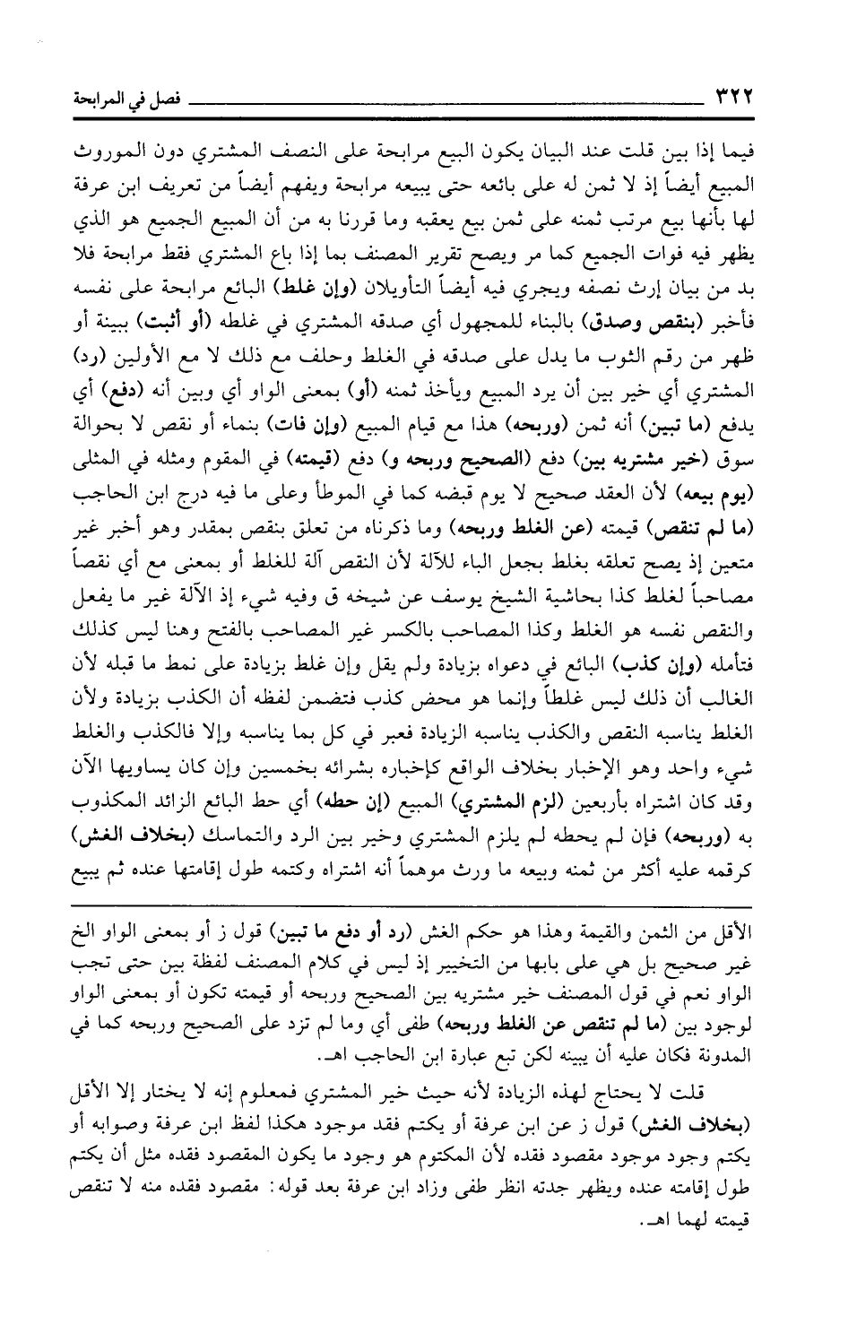 فيما إذا بين قلت عند البيان يكون البيع مرابحة على النصف المشتري دون الموروث المبيع أيضًا إذ لا ثمن له على بائعه حتى يبيعه مرابحة ويفهم أيضًا من تعريف ابن عرفة لها بأنها بيع مرتب ثمنه على ثمن بيع يعقبه وما قررنا به من أن المبيع الجميع هو الذي يظهر فيه فوات الجميع كما مر ويصح تقرير المصنف بما إذا باع المشتري فقط مرابحة فلا بد من بيان إرث نصفه ويجري فيه أيضًا التأويلان (وإن غلط) البائع مرابحة على نفسه فأخبر (بنقص وصدق) بالبناء للمجهول أي صدقه المشتري في غلطه (أو أثبت) ببينة أو ظهر من رقم الثوب ما يدل على صدقه في الغلط وحلف مع ذلك لا مع الأولين (رد) المشتري أي خير بين أن يرد المبيع ويأخذ ثمنه (أو) بمعنى الواو أي وبين أنه (دفع) أي يدفع (ما تبين) أنه ثمن (وربحه) هذا مع قيام المبيع (وإن فات) بنماء أو نقص لا بحوالة سوق (خير مشتريه بين) دفع (الصحيح وربحه و) دفع (قيمته) في المقوم ومثله في المثلى (يوم بيعه) لأن العقد صحيح لا يوم قبضه كما في الموطأ وعلى ما فيه درج ابن الحاجب (ما لم تنقص) قيمته (عن الغلط وربحه) وما ذكرناه من تعلق بنقص بمقدر وهو أخبر غير متعين إذ يصح تعلقه بغلط بجعل الباء للآلة لأن النقص آلة للغلط أو بمعنى مع أي نقصًا مصاحبًا لغلط كذا بحاشية الشيخ يوسف عن شيخه ق وفيه شيء إذ الآلة غير ما يفعل والنقص نفسه هو الغلط وكذا المصاحب بالكسر غير المصاحب بالفتح وهنا ليس كذلك فتأمله (وإن كذب) البائع في دعواه بزيادة ولم يقل وإن غلط بزيادة على نمط ما قبله لأن الغالب أن ذلك ليس غلطًا وإنما هو محض كذب فتضمن لفظه أن الكذب بزيادة ولأن الغلط يناسبه النقص والكذب يناسبه الزيادة فعبر في كل بما يناسبه وإلا فالكذب والغلط شيء واحد وهو الإخبار بخلاف الواقع كإخباره بشرائه بخمسين وإن كان يساويها الآن وقد كان اشتراه بأربعين (لزم المشتري) المبيع (إن حطه) أي حط البائع الزائد المكذوب به (وربحه) فإن لم يحطه لم يلزم المشتري وخير بين الرد والتماسك (بخلاف الغش) كرقمه عليه أكثر من ثمنه وبيعه ما ورث موهمًا أنه اشتراه وكتمه طول إقامتها عنده ثم يبيع