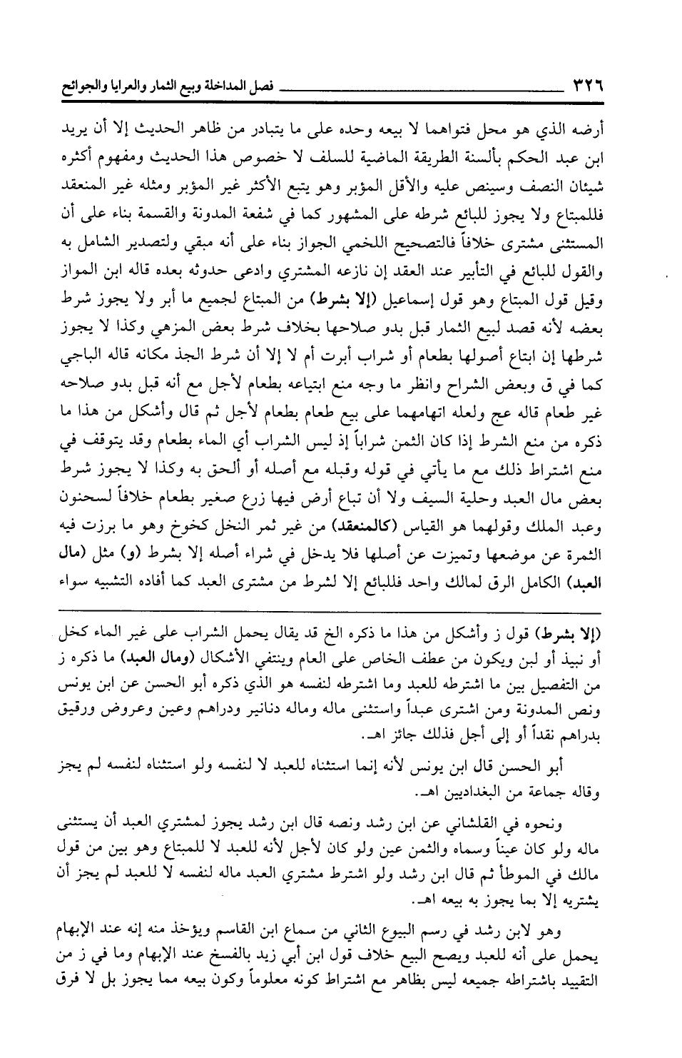 أرضه الذي هو محل فتواهما لا بيعه وحده على ما يتبادر من ظاهر الحديث إلا أن يريد ابن عبد الحكم بألسنة الطريقة الماضية للسلف لا خصوص هذا الحديث ومفهوم أكثره شيئان النصف وسينص عليه والأقل المؤبر وهو يتبع الأكثر غير المؤبر ومثله غير المنعقد فللمبتاع ولا يجوز للبائع شرطه على المشهور كما في شفعة المدونة والقسمة بناء على أن المستثنى مشترى خلافًا فالتصحيح اللخمي الجواز بناء على أنه مبقي ولتصدير الشامل به والقول للبائع في التأبير عند العقد إن نازعه المشتري وادعى حدوثه بعده قاله ابن المواز وقيل قول المبتاع وهو قول إسماعيل (إلا بشرط) من المبتاع لجميع ما أبر ولا يجوز شرط بعضه لأنه قصد لبيع الثمار قبل بدو صلاحها بخلاف شرط بعض المزهي وكذا لا يجوز شرطها إن ابتاع أصولها بطعام أو شراب أبرت أم لا إلا أن شرط الجد مكانه قاله الباجي كما في ق وبعض الشراح وانظر ما وجه منع ابتياعه بطعام لأجل مع أنه قبل بدو صلاحه غير طعام قاله عج ولعله اتهامهما على بيع طعام بطعام لأجل ثم قال وأشكل من هذا ما ذكره من منع الشرط إذا كان الثمن شرابًا إذ ليس الشراب أي الماء بطعام وقد يتوقف في منع اشتراط ذلك مع ما يأتي في قوله وقبله مع أصله أو ألحق به وكذا لا يجوز شرط بعض مال العبد وحلية السيف ولا أن تباع أرض فيها زرع صغير بطعام خلافًا لسحنون وعبد الملك وقولهما هو القياس (كالمنعقد) من غير ثمر النخل كخوخ وهو ما برزت فيه الثمرة عن موضعها وتميزت عن أصلها فلا يدخل في شراء أصله إلا بشرط (و) مثل (مال العبد) الكامل الرف لمالك واحد فللبائع إلا لشرط من مشترى العبد كما أفاده التشبيه سواء
