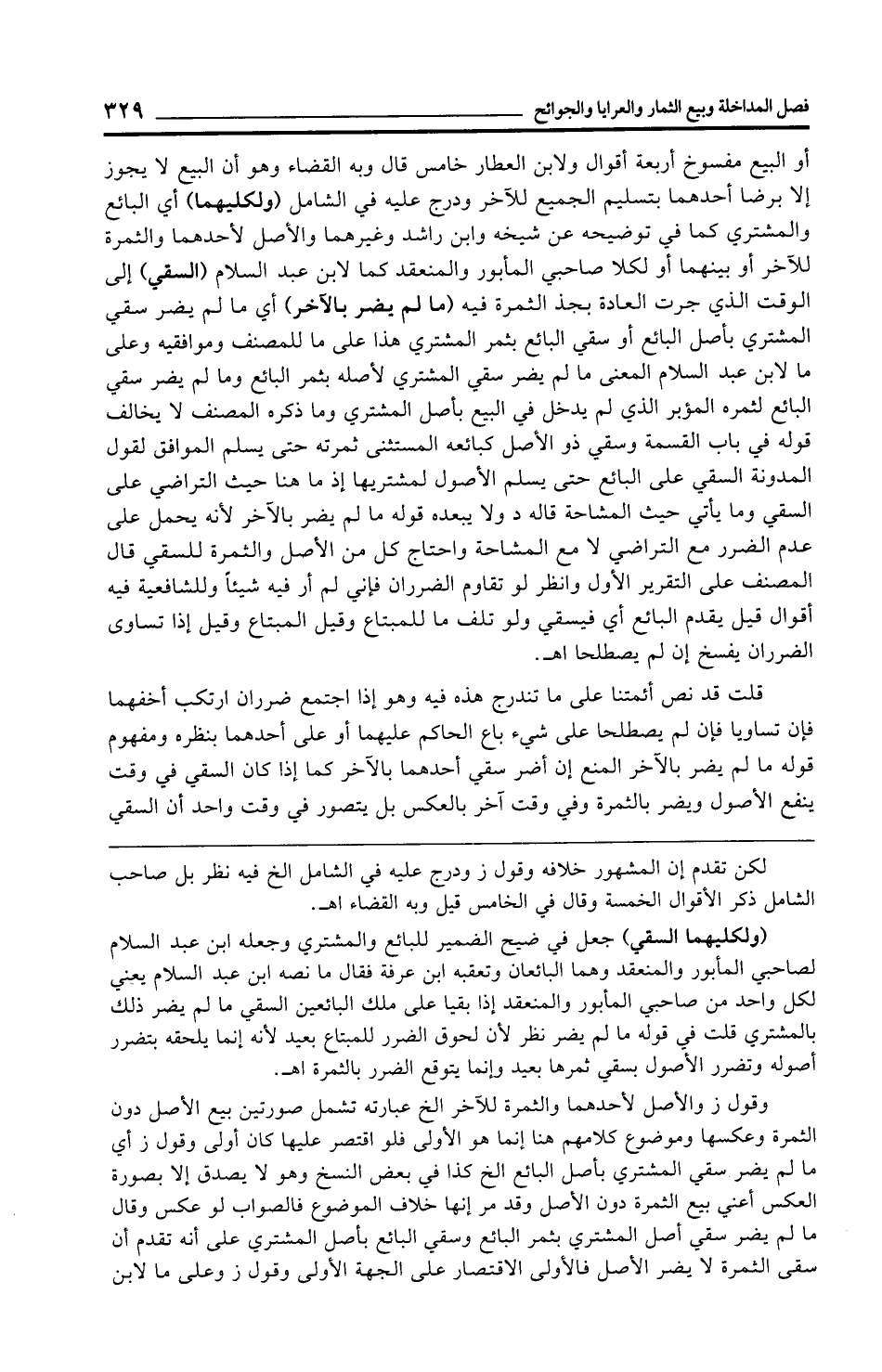 (ولكليهما السقي) جعل في ضيح الضمير للبائع والمشتري وجعله ابن عبد السلام لصاحبي المأبور والمنعقد وهما البائعان وتعقبه ابن عرفة فقال ما نصه ابن عبد السلام يعني لكل واحد من صاحبي المأبور والمنعقد إذا بقيا على ملك البائعين السقي ما لم يضر ذلك بالمشتري قلت في قوله ما لم يضر نظر لأن لحوق الضرر للمبتاع بعيد لأنه إنما يلحقه بتضرر أصوله وتضرر الأصول بسقي ثمرها بعيد وإنما يتوقع الضرر بالثمرة اهـ.
