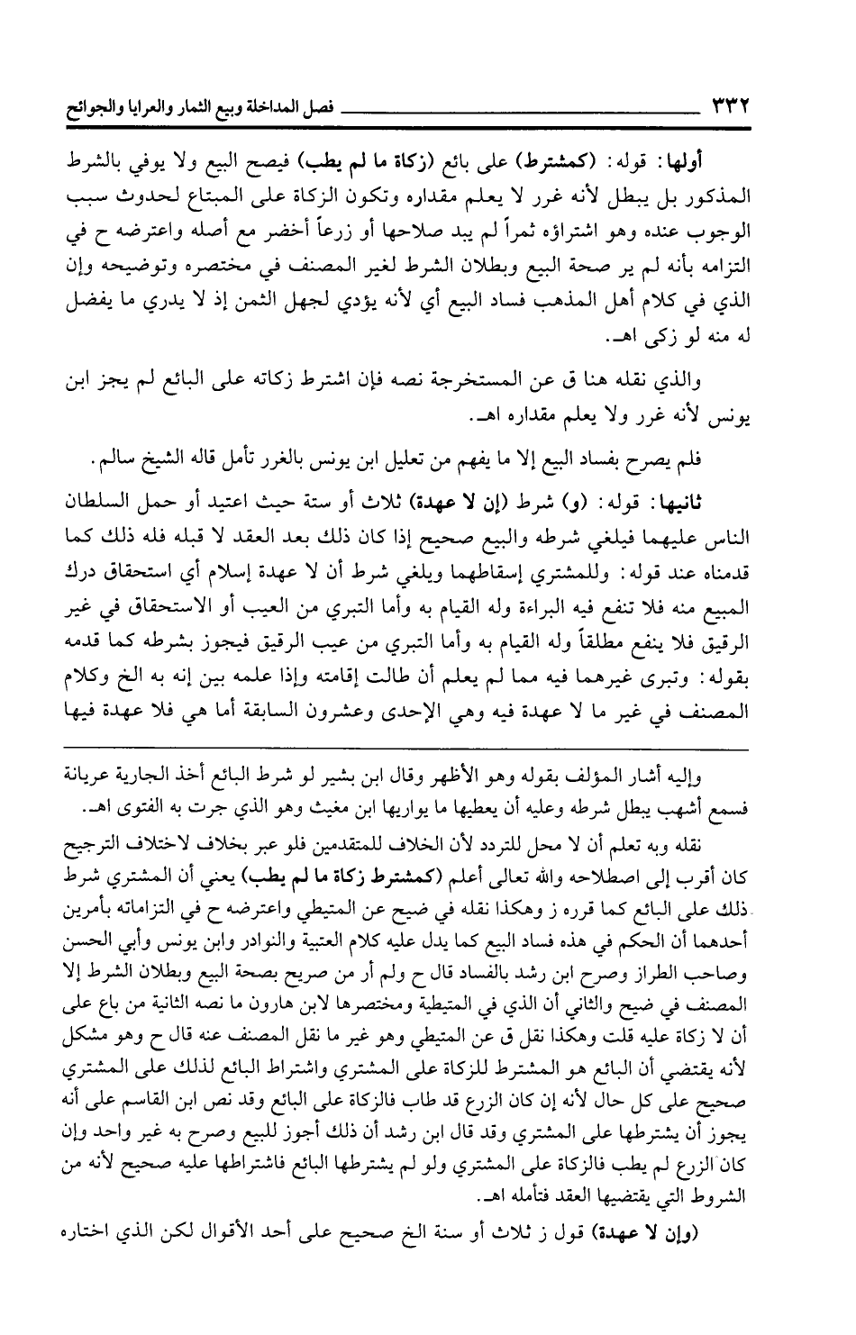 أولها: قوله: (كمشترط) على بائع (زكاة ما لم يطلب) فيصح البيع ولا يوفي بالشرط المذكور بل يبطل لأنه غرر لا يعلم مقداره وتكون الزكاة على المبتاع لحدوث سبب الوجوب عنده وهو اشتراؤه ثمرًا لم يبد صلاحها أو زرعًا أخضر مع أصله واعترضه ح في التزامه بأنه لم ير صحة البيع وبطلان الشرط لغير المصنف في مختصره وتوضيحه وإن الذي في كلام أهل المذهب فساد البيع أي لأنه يؤدي لجهل الثمن إذ لا يدري ما يفضل له منه لو زكى اهـ.