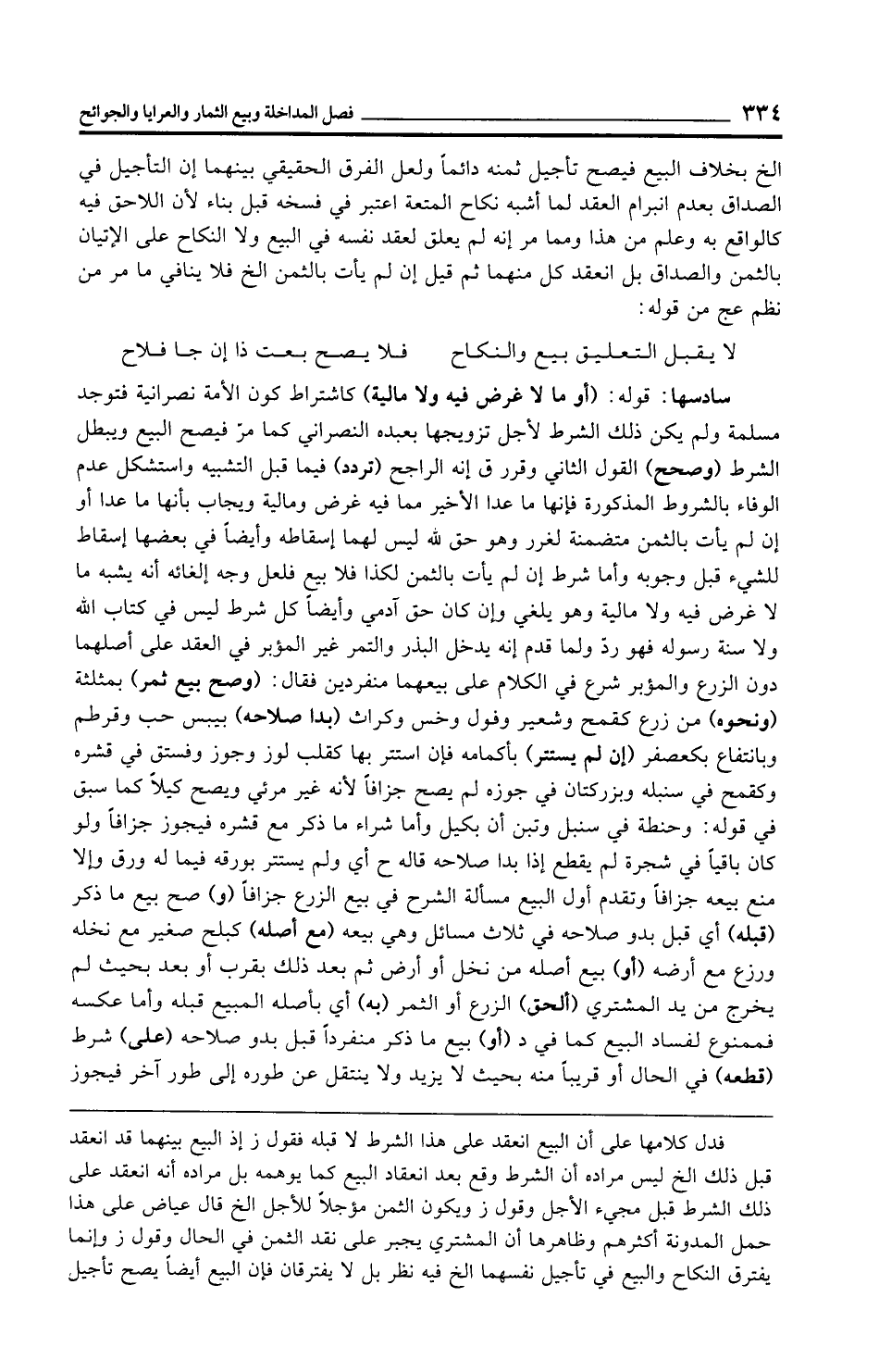سادسها: قوله: (أو ما لا غرض فيه ولا مالية) كاشتراط كون الأمة نصرانية فتوجد مسلمة ولم يكن ذلك الشرط لأجل تزويجها بعبده النصراني كما مرّ فيصح البيع ويبطل الشرط (وصحح) القول الثاني وقرر ق إنه الراجح (تردد) فيما قبل التشبيه واستشكل عدم الوفاء بالشروط المذكورة فإنها ما عدا الأخبر مما فيه غرض ومالية ويجاب بأنها ما عدا أو إن لم يأت بالثمن متضمنة لغرر وهو حق لله ليس لهما إسقاطه وأيضًا في بعضها إسقاط للشيء قبل وجوبه وأما شرط إن لم يأت بالثمن لكذا فلا بيع فلعل وجه إلغائه أنه يشبه ما لا غرض فيه ولا مالية وهو يلغي وإن كان حق آدمي وأيضًا كل شرط ليس في كتاب الله ولا سنة رسوله فهو ردّ ولما قدم إنه يدخل البذر والتمر غير المؤبر في العقد على أصلهما دون الزرع والمؤبر شرع في الكلام على بيعهما منفردين فقال: (وصح بيع ثمر) بمثلثة (ونحوه) من زرع كقمح وشعير وفول وخس وكراث (بدا صلاحه) بيبس حب وقرطم وبانتفاع بكعصفر (إن لم يستتر) بأكمامه فإن استتر بها كقلب لوز وجوز وفستق في قشره وكقمح في سنبله وبزر كتان في جوزه لم يصح جزافًا لأنه غير مرئي ويصح كيلًا كما سبق في قوله: وحنطة في سنبل وتبن أن بكيل وأما شراء ما ذكر مع قشره فيجوز جزافًا ولو كان باقيًا في شجرة لم يقطع إذا بدا صلاحه قاله ح أي ولم يستتر بورقه فيما له ورق وإلا منع بيعه جزافًا وتقدم أول البيع مسألة الشرح في بيع الزرع جزافًا (و) صح بيع ما ذكر (قبله) أي قبل بدو صلاحه في ثلاث مسائل وهي بيعه (مع أصله) كبلح صغير مع نخله ورزع مع أرضه (أو) بيع أصله من نخل أو أرض ثم بعد ذلك بقرب أو بعد بحيث لم يخرج من يد المشتري (ألحق) الزرع أو الثمر (به) أي بأصله المبيع قبله وأما عكسه فممنوع لفساد البيع كما في د (أو) بيع ما ذكر منفردًا قبل بدو صلاحه (على) شرط (قطعه) في الحال أو قريبًا منه بحيث لا يزيد ولا ينتقل عن طوره إلى طور آخر فيجوز